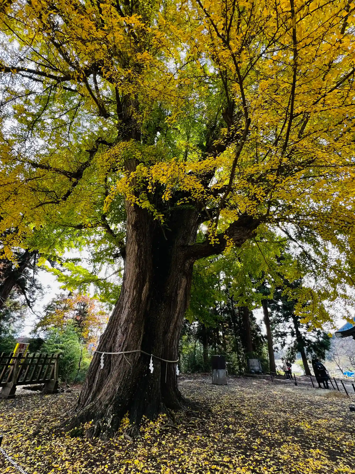 奥がご神木の大イチョウです。私が行った時は葉が落ちきって一面黄金の絨毯になっていました。