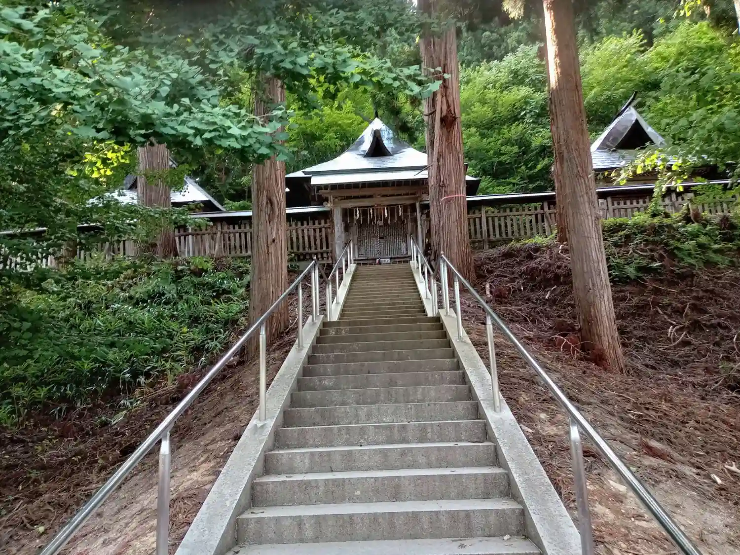 石段をのぼった山の中腹に、玉垣めぐらして三殿並列し、東を向いて建っている。