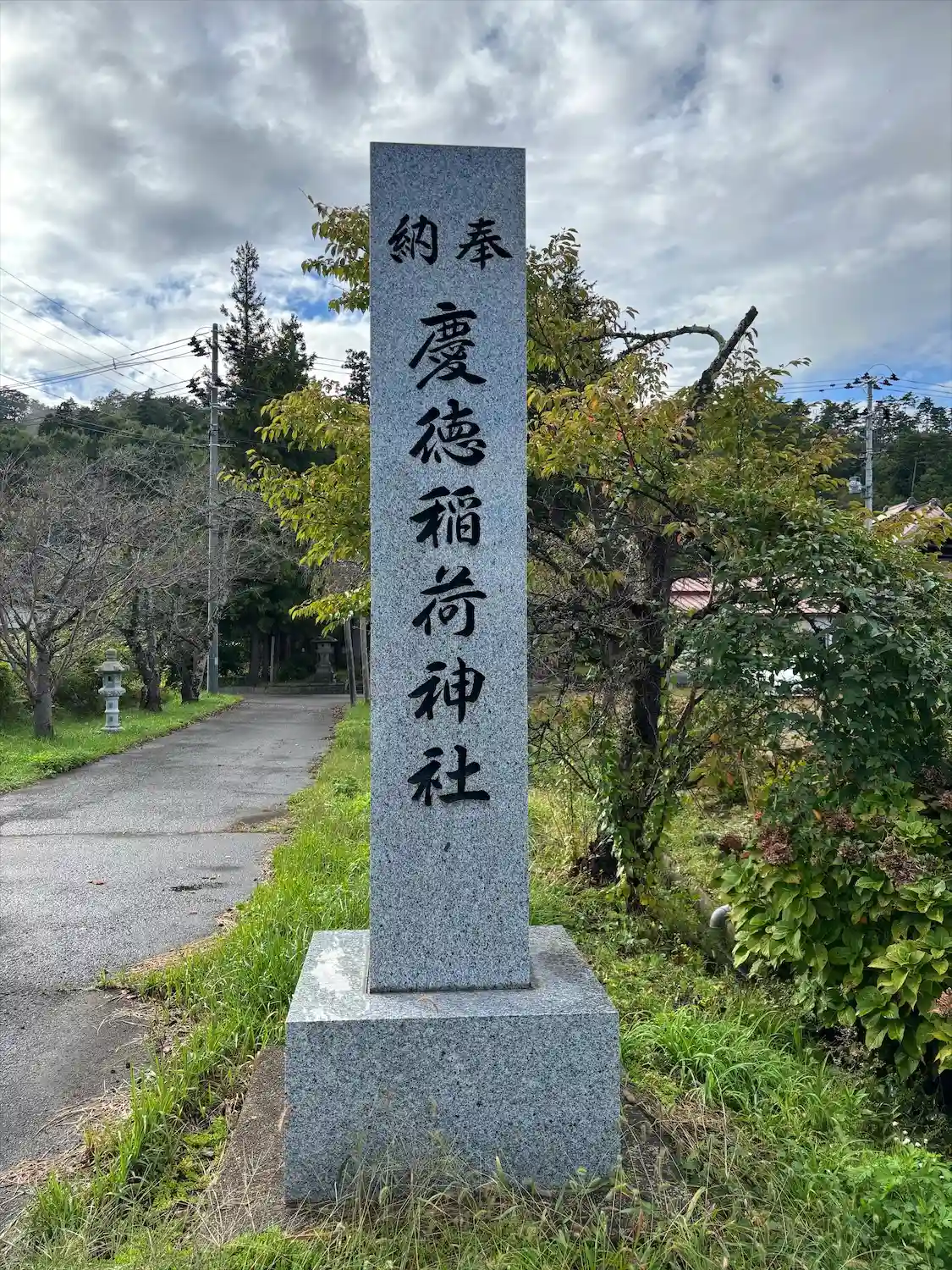 道路を渡ってニノ鳥居へ向かう参道には新しい社号標があり、こちらには慶徳稲荷神社と神社名がきちんと記されてました。