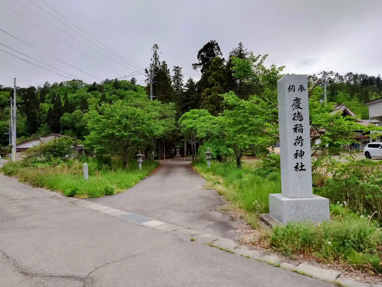 道路を渡ってニノ鳥居へ向かう参道には新しい社号標があり、こちらには慶徳稲荷神社と神社名がきちんと記されてました。