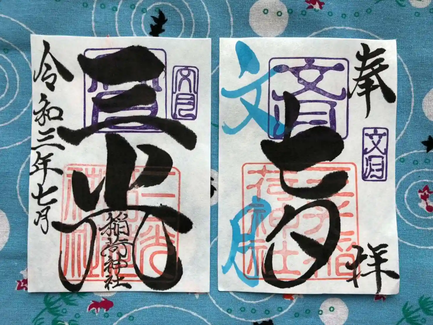 文月の見開き御朱印は、社印は朱色・文月印は紫色・文月の奉筆は水色・墨書きは、奉拝・『七夕』・三光稲荷神社・令和三年七月とさせていただきます。