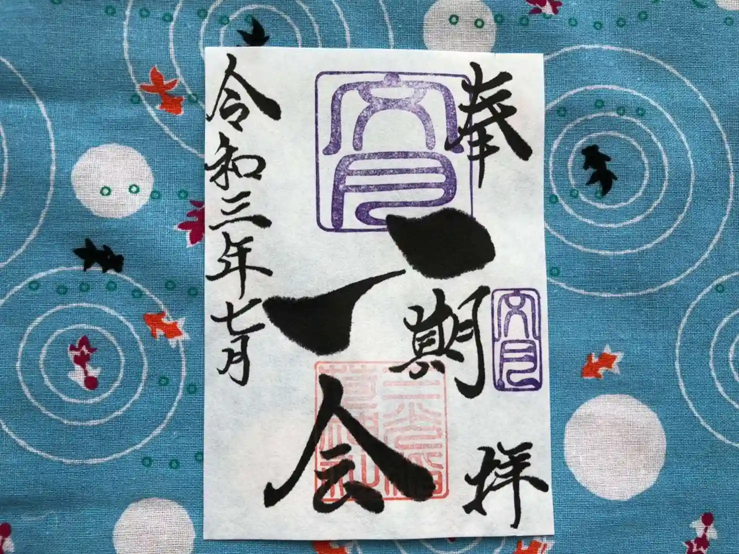 文月の『一期一会』御朱印は、社印は朱色・文月印は紫色・墨書きは、