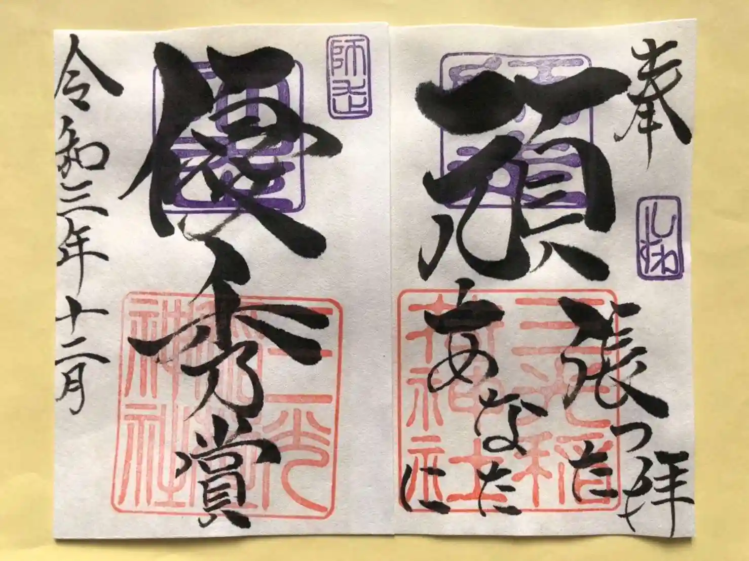 師走の『頑張ったあなたに 優秀賞』見開き御朱印は、社印は朱色・師走印は紫色・墨書きは、奉拝・『頑張ったあなたに 優秀賞』・令和三年十二月とさせていただきます。