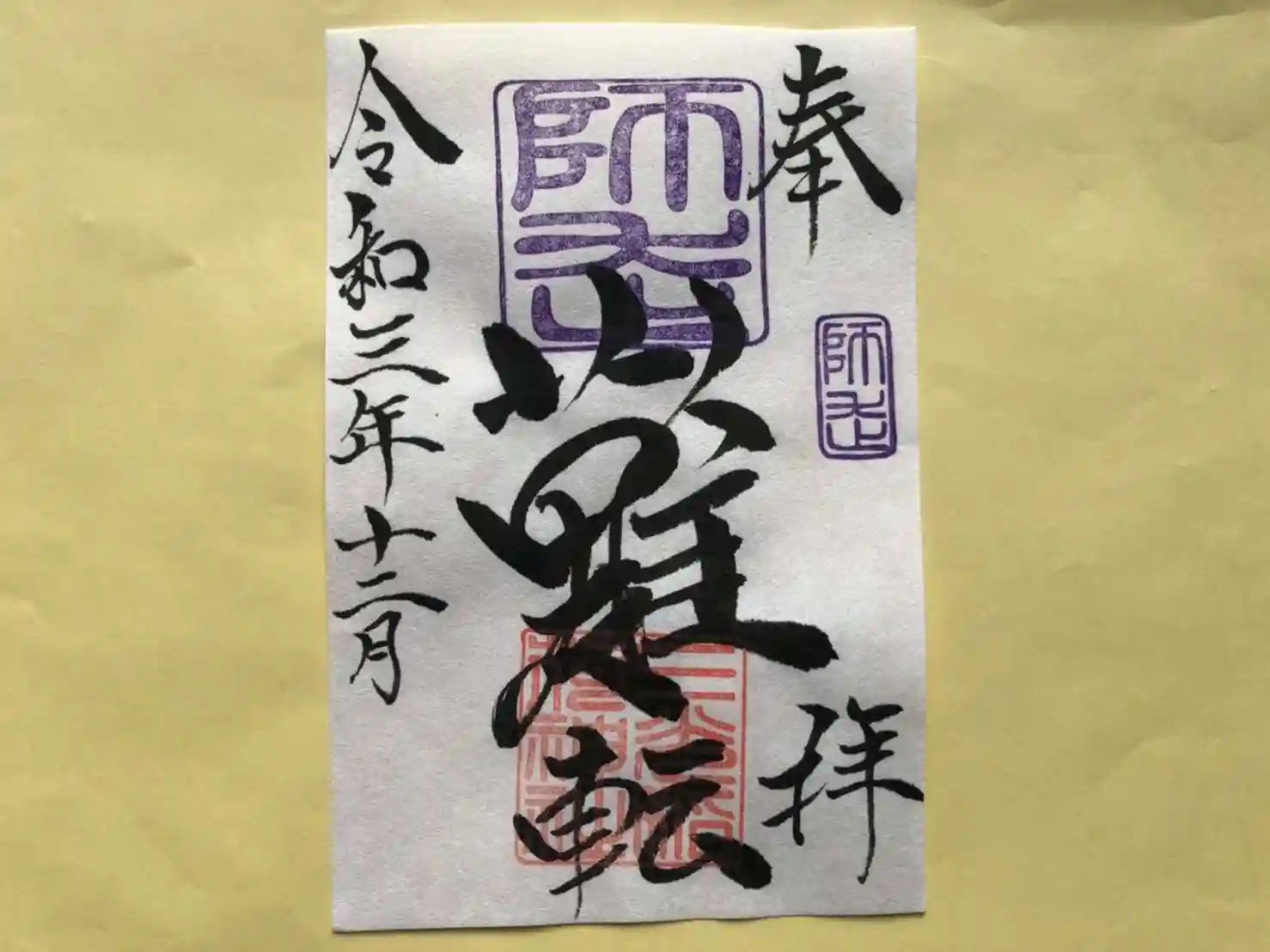 師走の「難転」御朱印は、社印は朱色・師走印は紫色・墨書きは、奉拝・「難転」・令和三年十二月とさせていただきます。