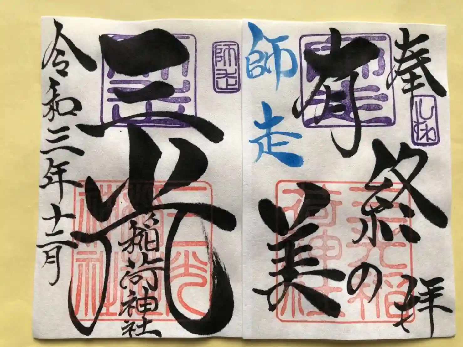 師走の見開き御朱印は、社印は朱色・師走印は紫色・師走の奉筆は青色・墨書きは、奉拝・『有終の美』・三光稲荷神社・令和三年十二月とさせていただきます。
