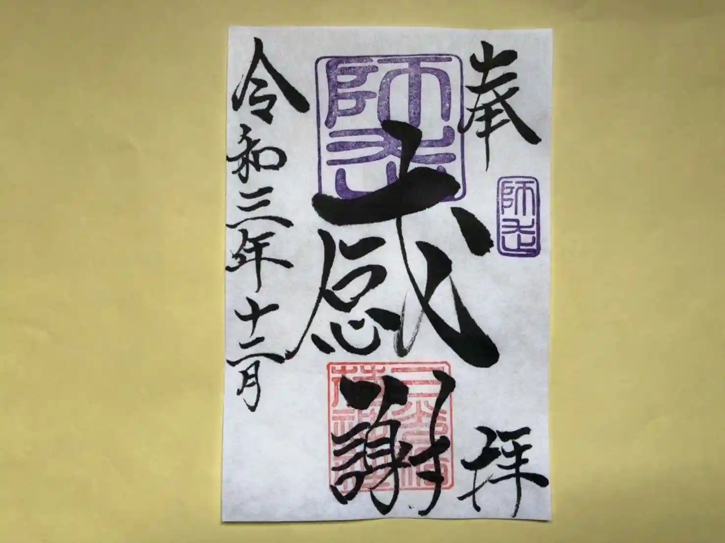 師走の「感謝」御朱印は、社印は朱色・師走印は紫色・墨書きは、奉拝・「感謝」・令和三年十二月とさせていただきます。