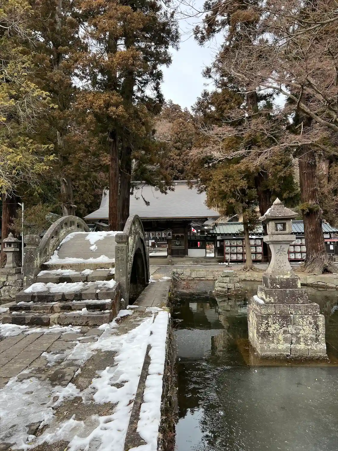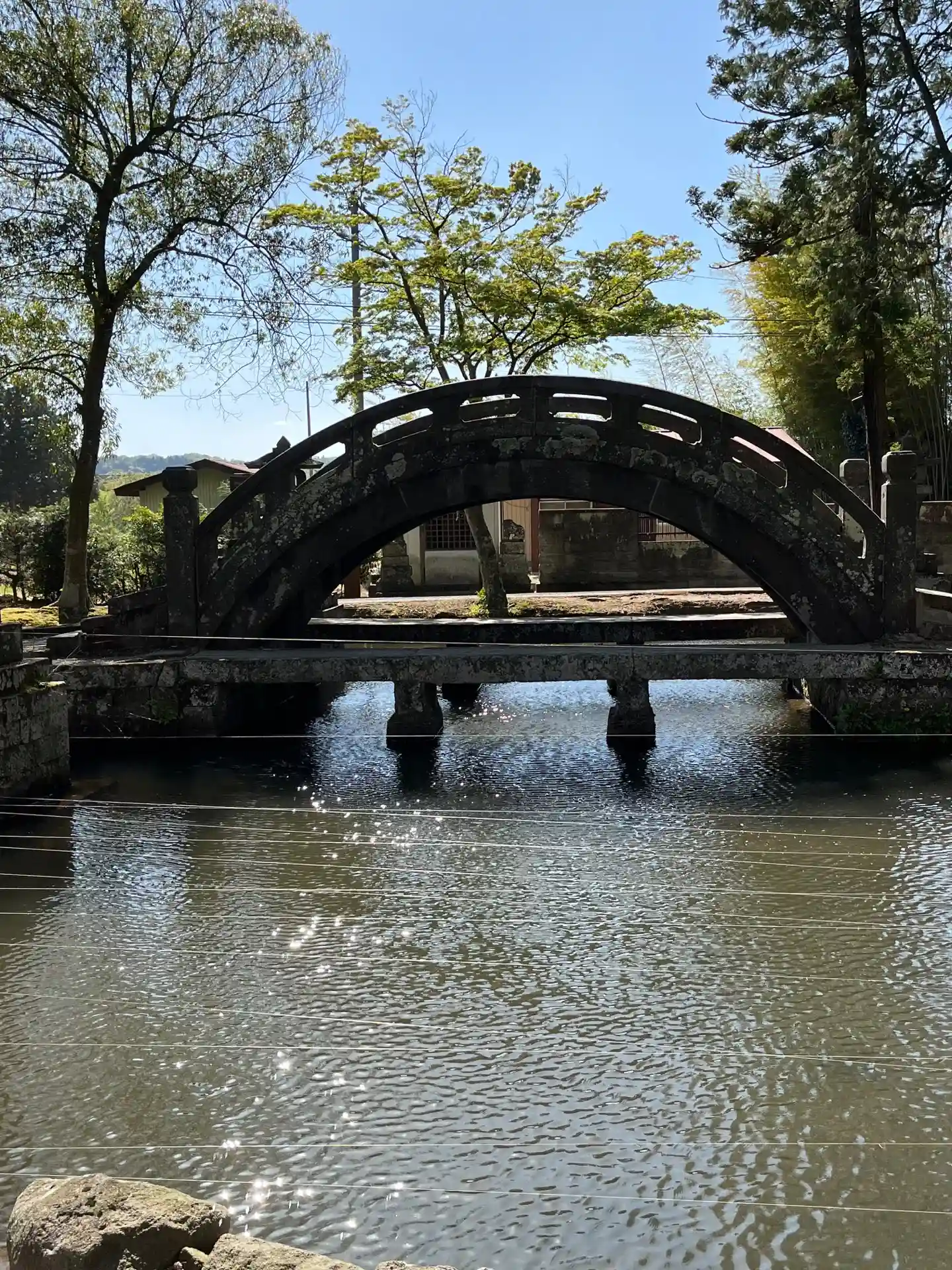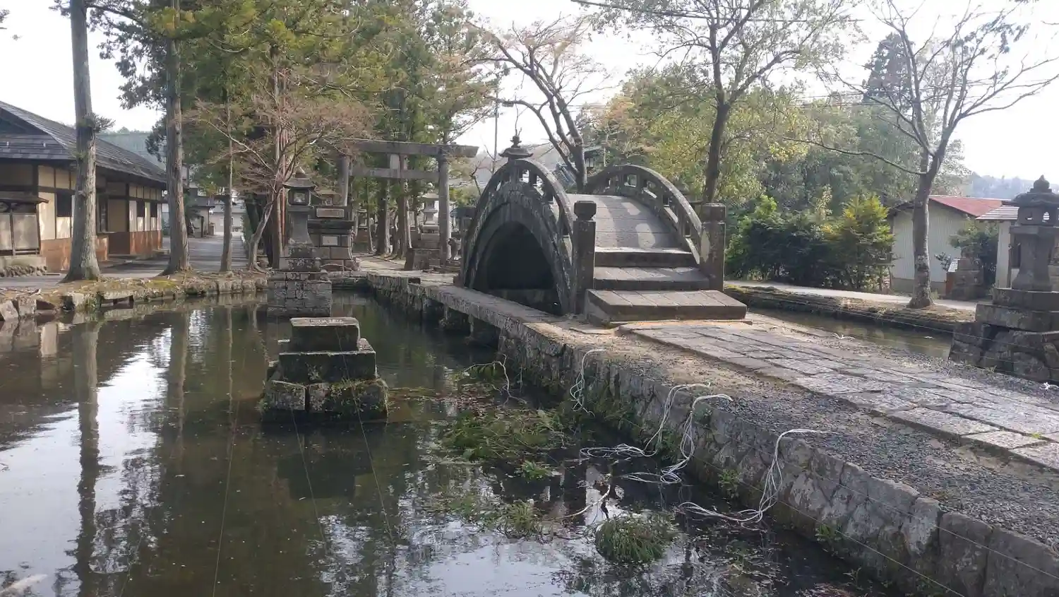 参道には池があり石の太鼓橋がありました。
