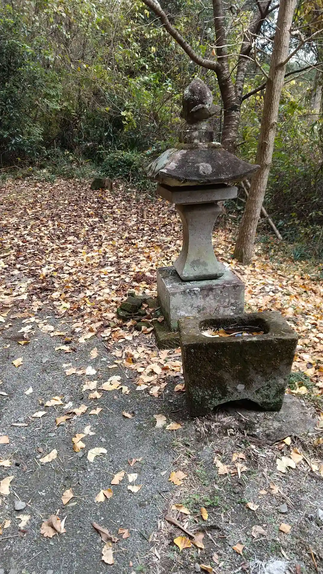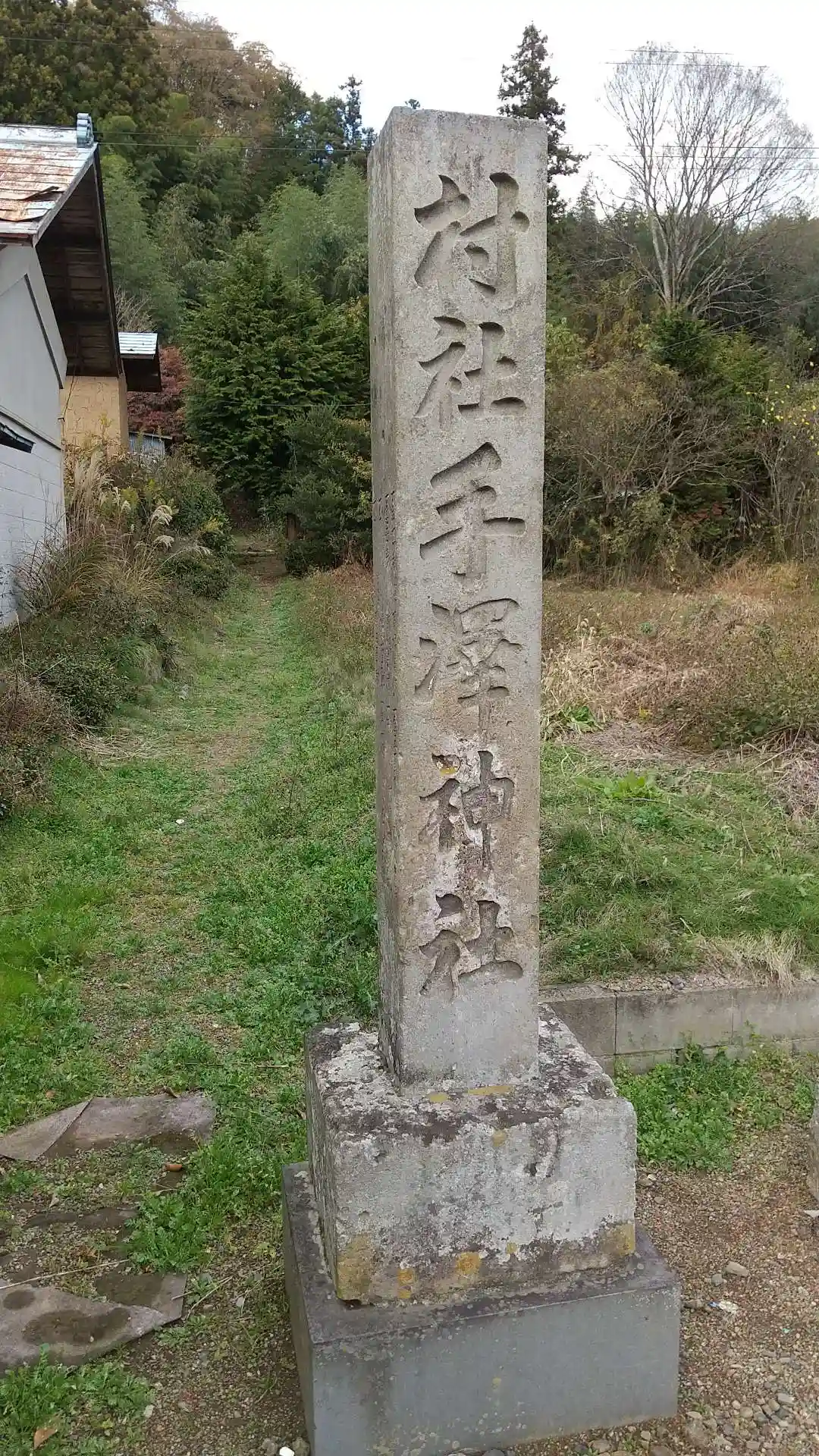 社号標が見えずらい位置にありました。鳥居は参道の途中の森の中で見えないです。