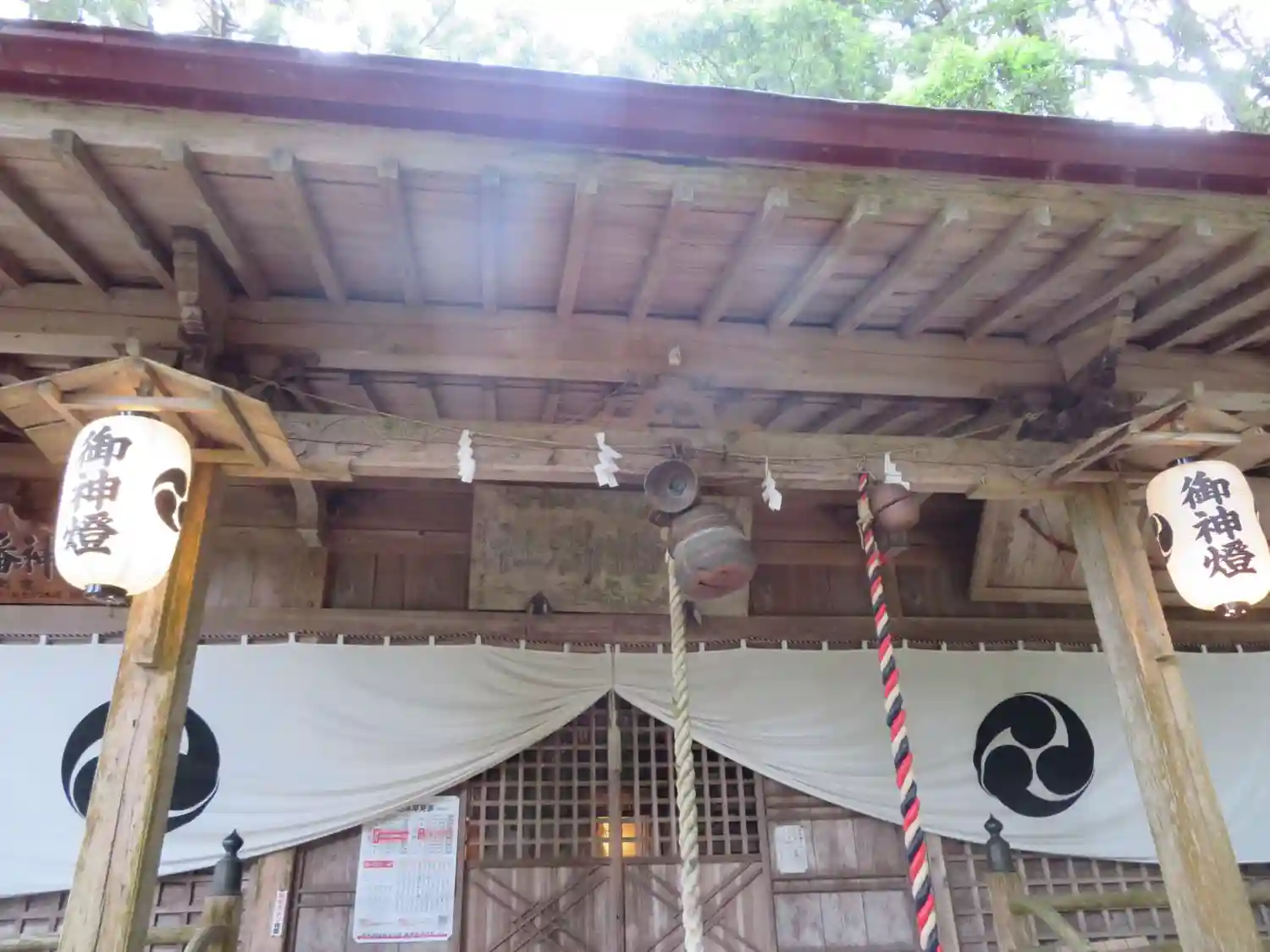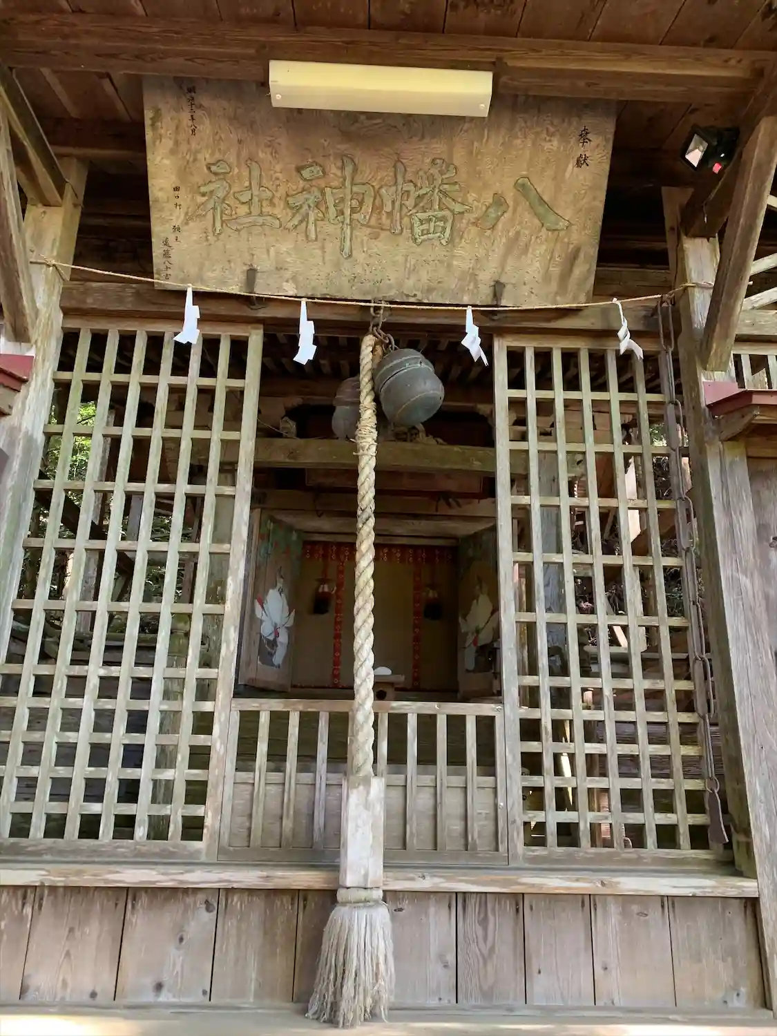 拝殿に向かう石段の前には背の高い立派な石灯籠があります。その隣には八幡神社の屏額がある社殿があります。