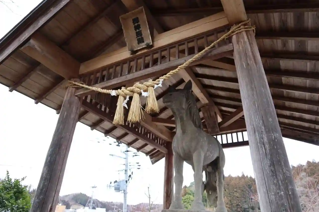 神社の境内に大きな石像の神馬が奉納されています