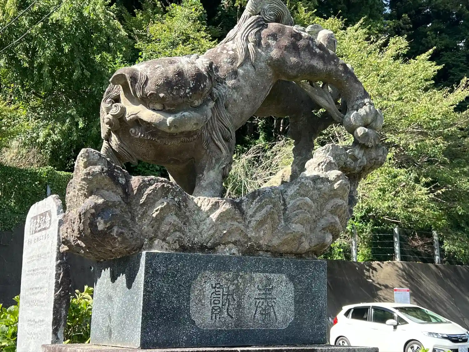 雄獅子(阿)・雌獅子(吽)とも、雲上に乗り後ろ脚を跳ね上げる、所謂「飛翔狛犬」である。なお、雌獅子には3匹の子獅子が付随する。