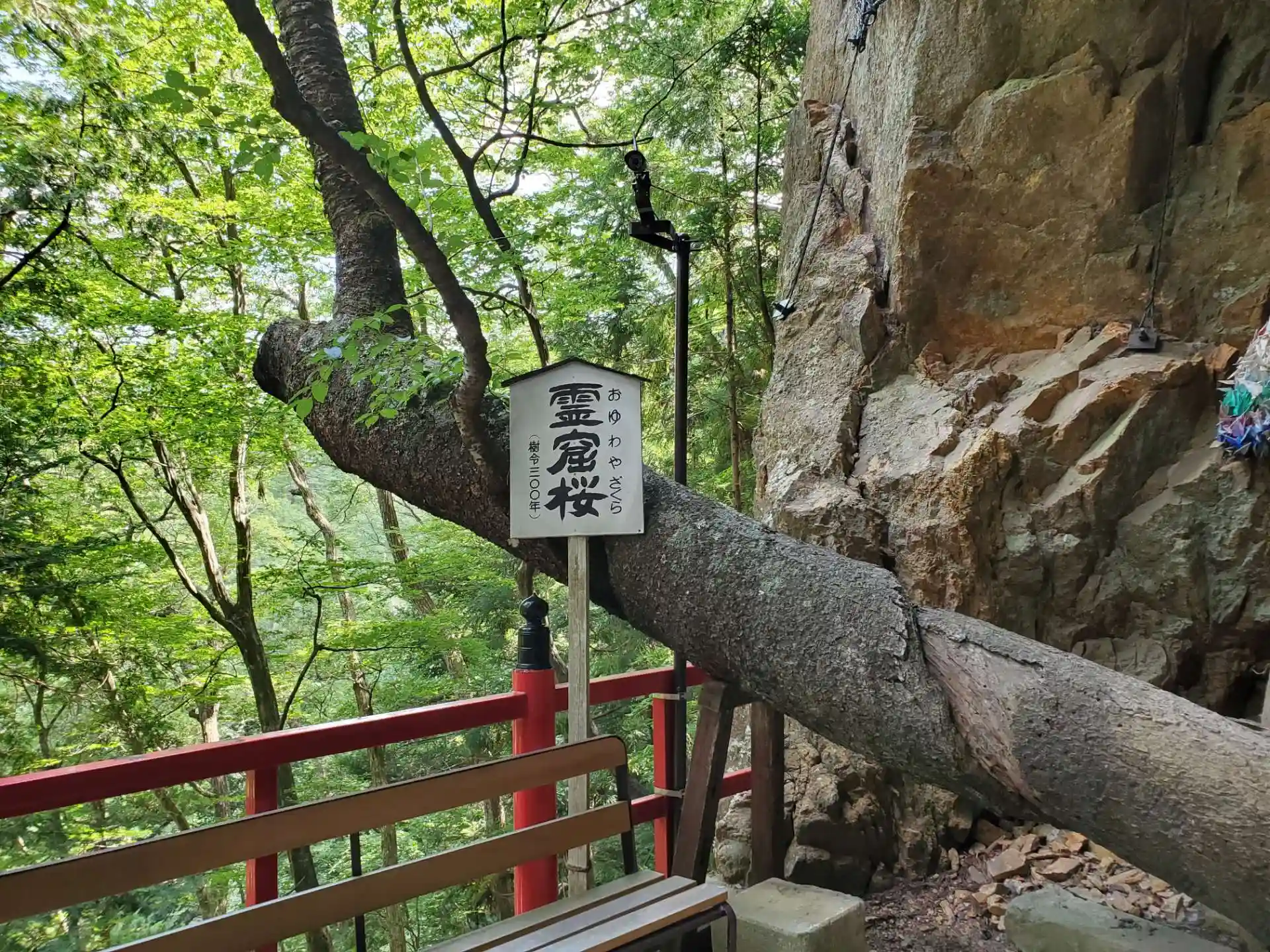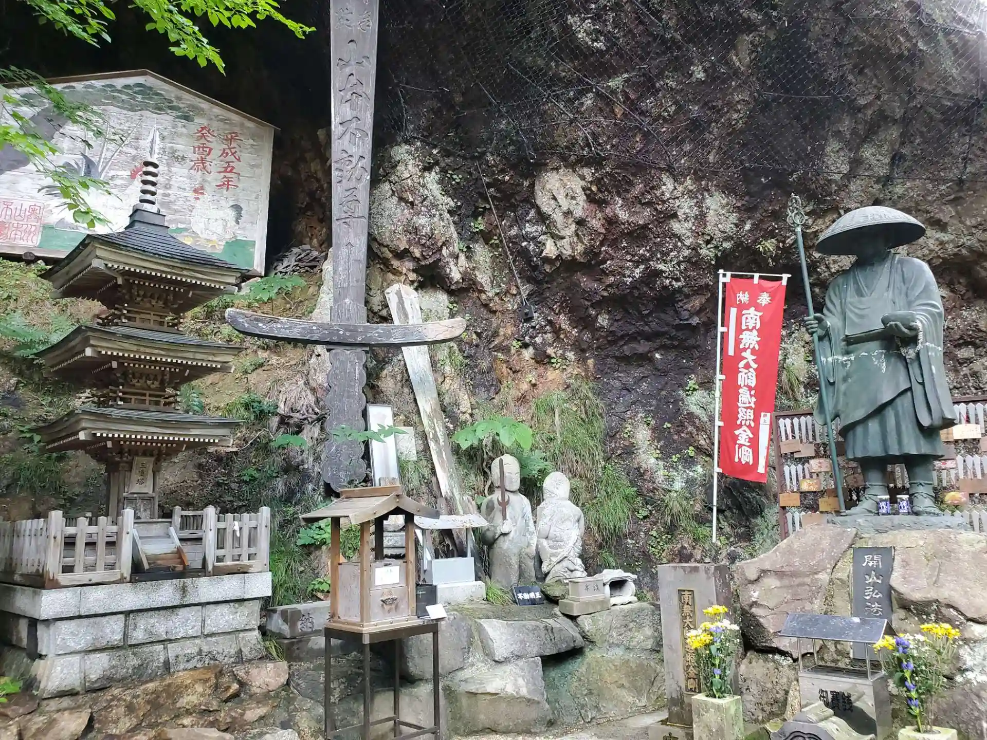 樹齢100年を超える杉並木を抜け、130段の石段を上りつめると巨岩の洞窟に御本尊が安置された霊場が出現します。