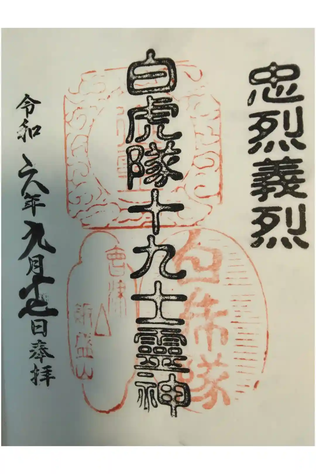 右に忠烈義烈、真ん中に白虎隊十九士霊神の文字、御霊白虎隊會津飯盛山の印が押された御朱印です。