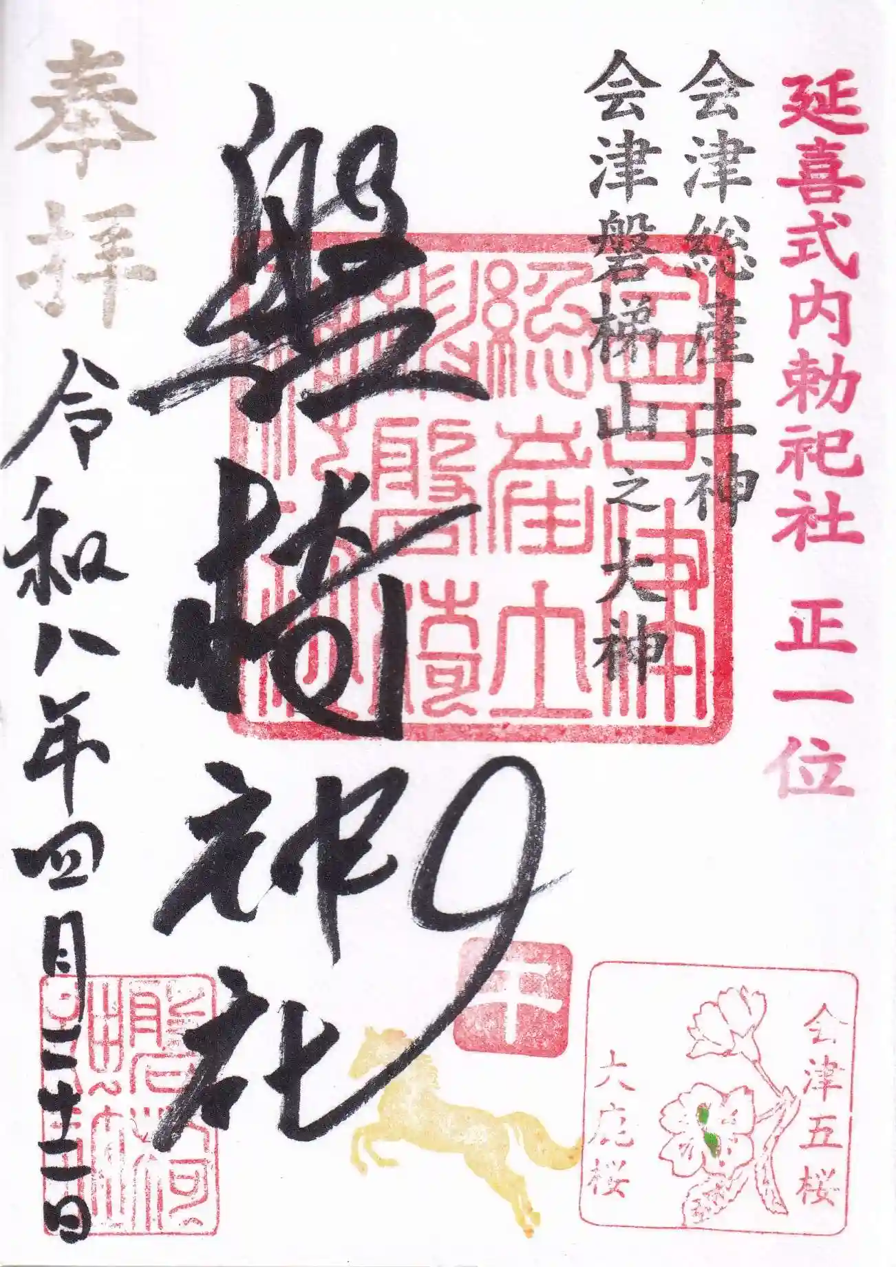 | ご由緒 | 会津はもとより県内外の人々から「いわきさま」と親しまれている社。十世紀に成立した全国の格式ある神社の一覧「延喜式神名帳」に耶麻郡一座としてあり、会津地方の伊佐須美神社(会津美里町)、蚕養国神社(会津若松市)とともに延喜式内社として信仰を集めました。