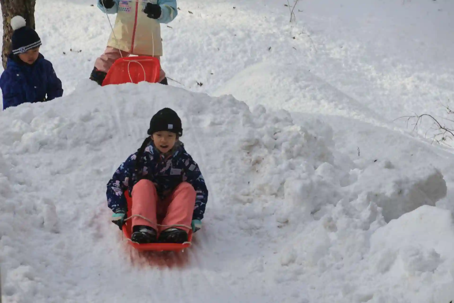 拝殿の前では子供たちがそり遊びを