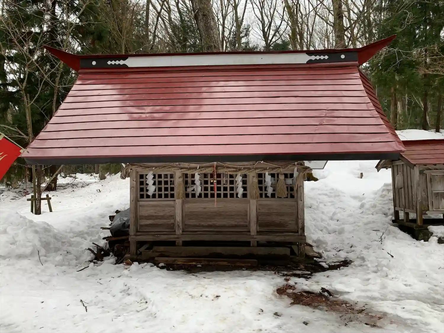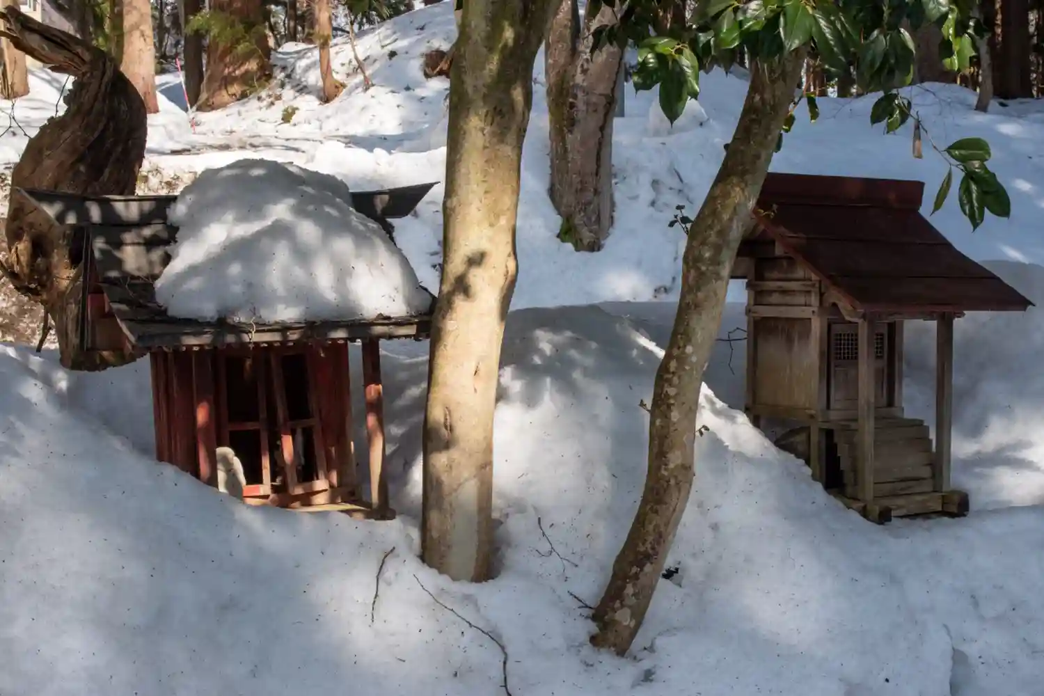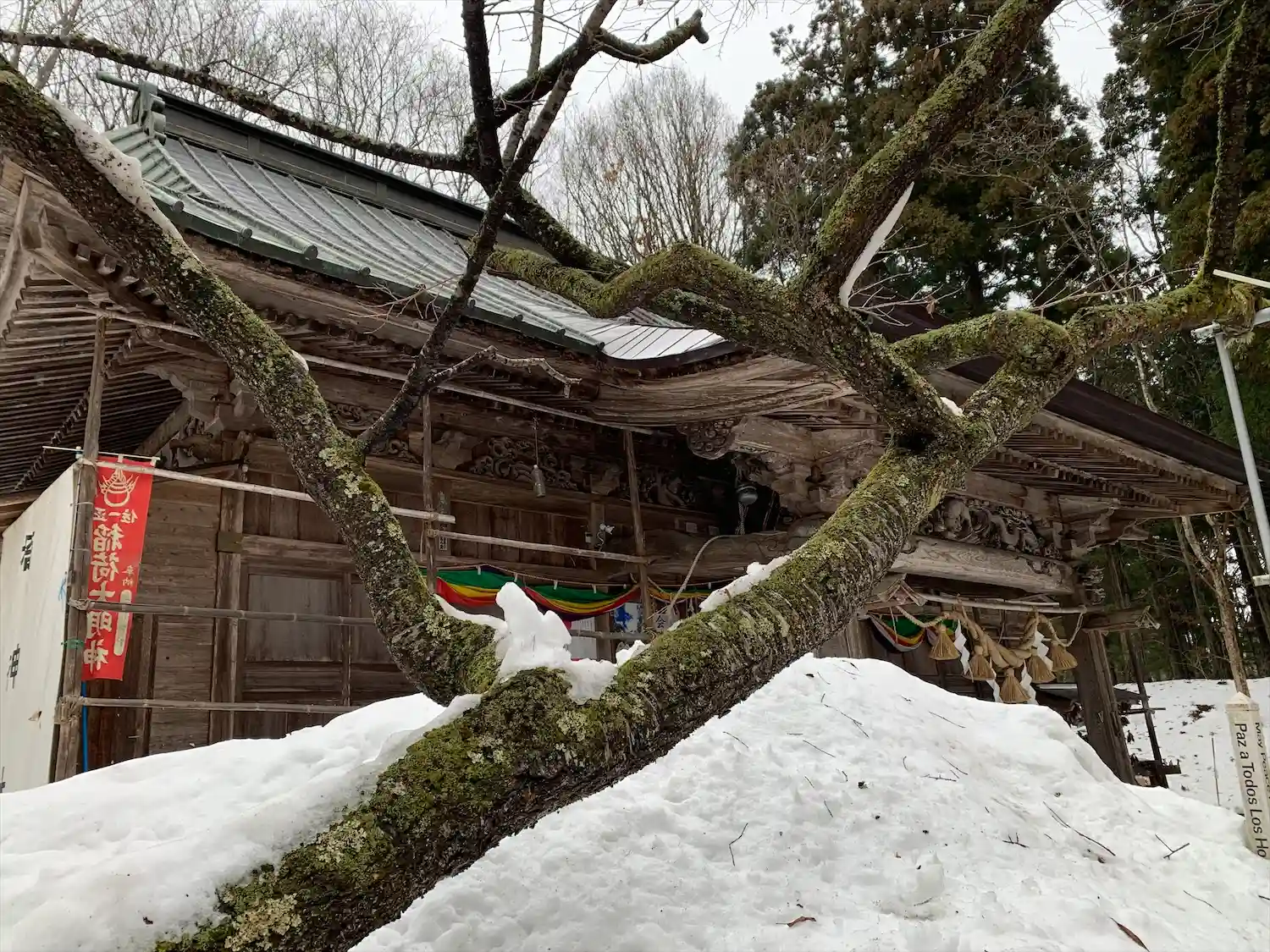 神社までの道のりはすれ違いのできない広さ、さらにシャーベット状の雪が固まった滑りやすい状態です。