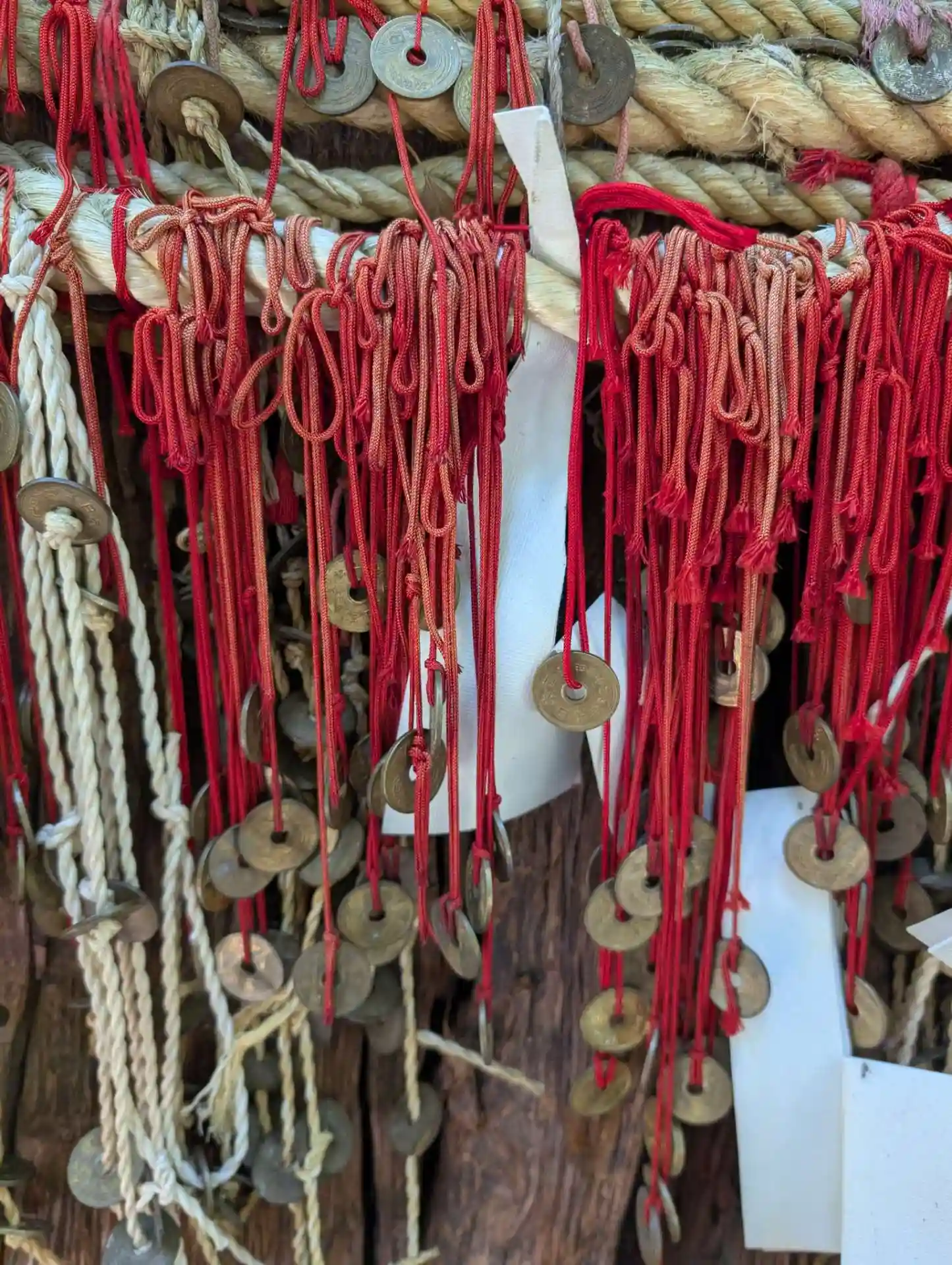 縁結び桜には糸につけられた5円玉が沢山くくられていました。