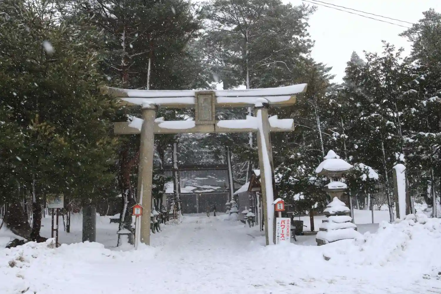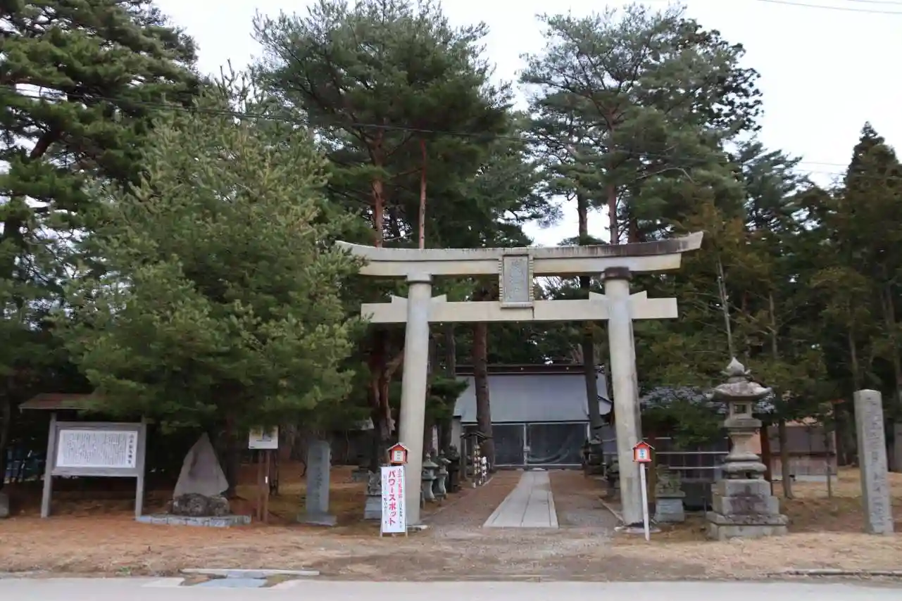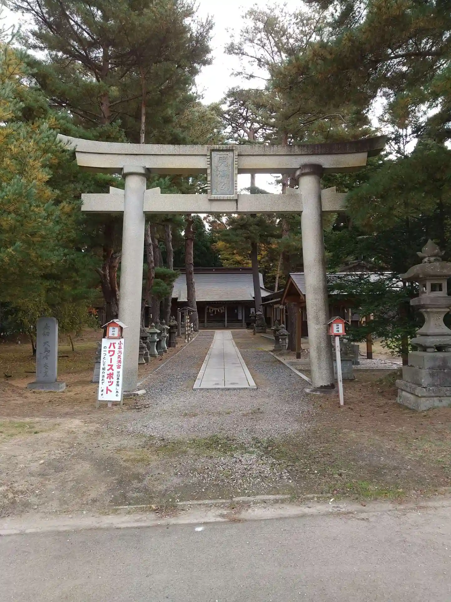 猪苗代湖畔に位置する小平潟天満宮の鳥居には、パワースポットと掲示板が設置されてます。