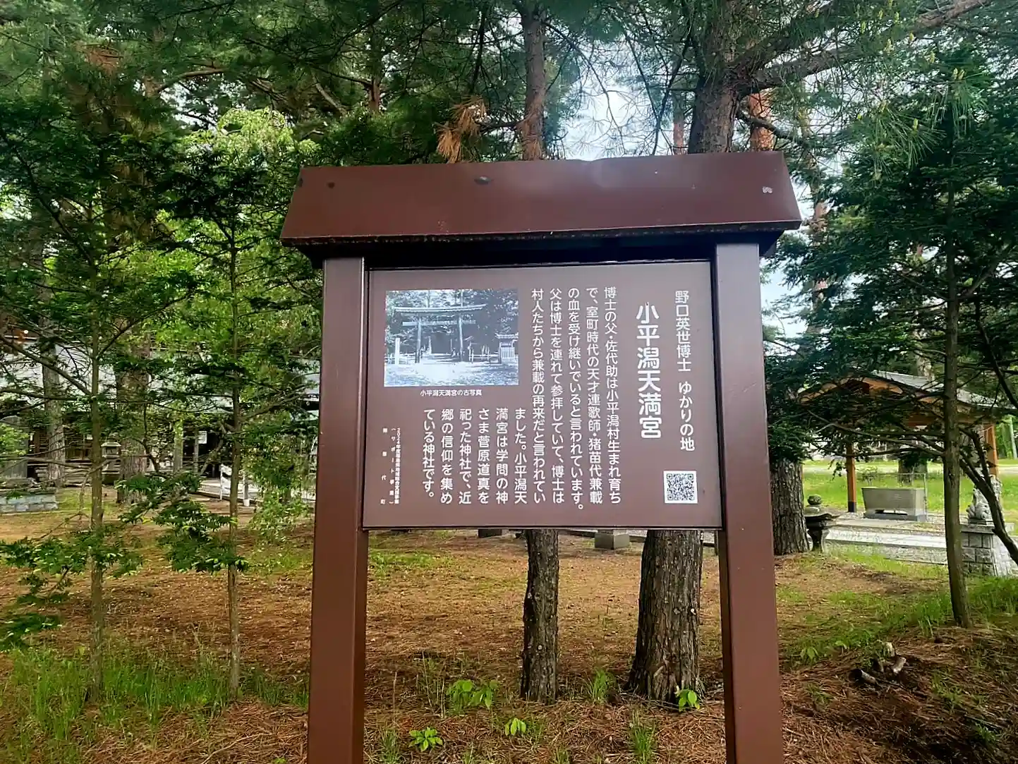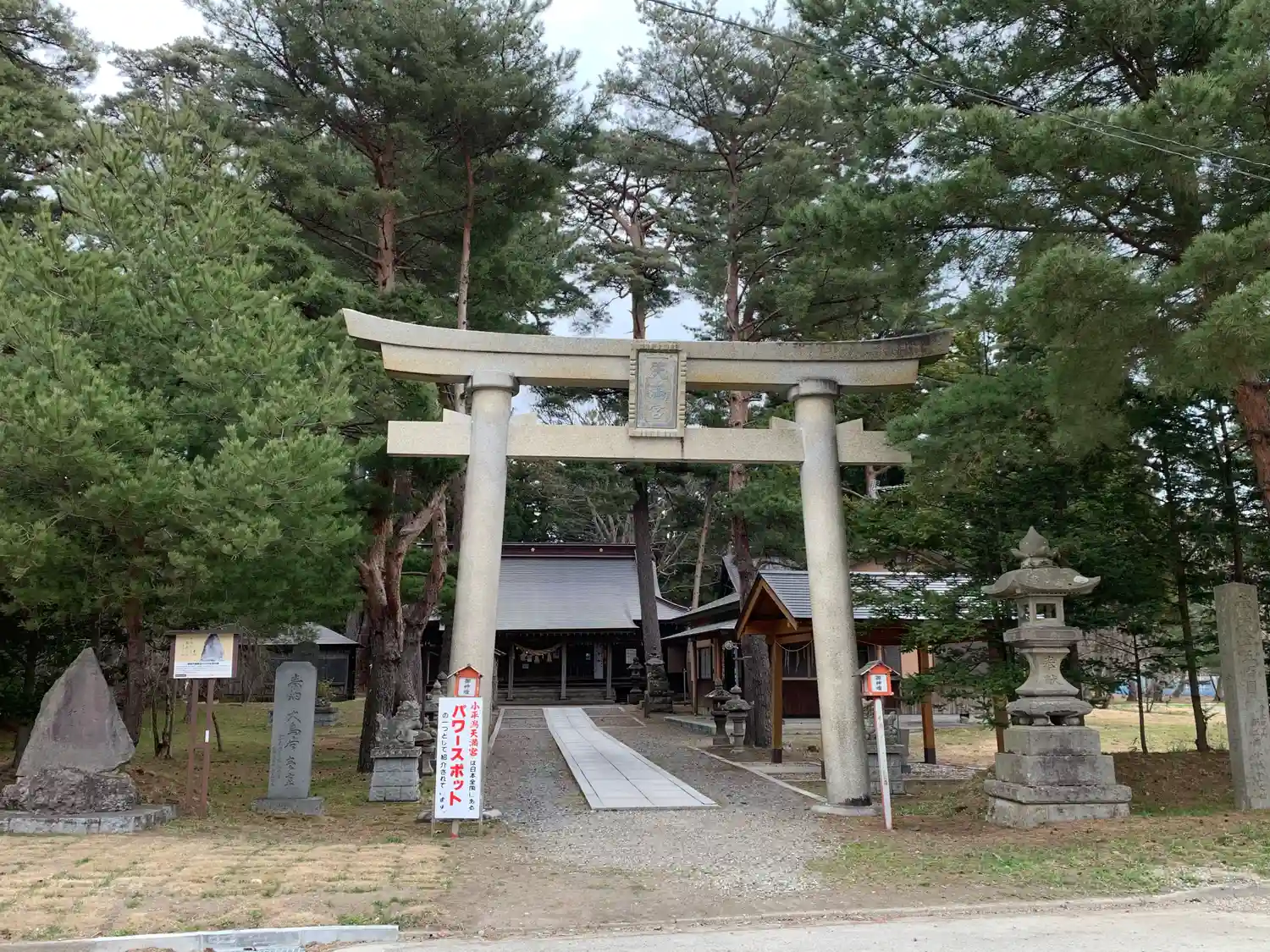 猪苗代湖畔に位置する小平潟天満宮の鳥居には、パワースポットと掲示板が設置されてます。