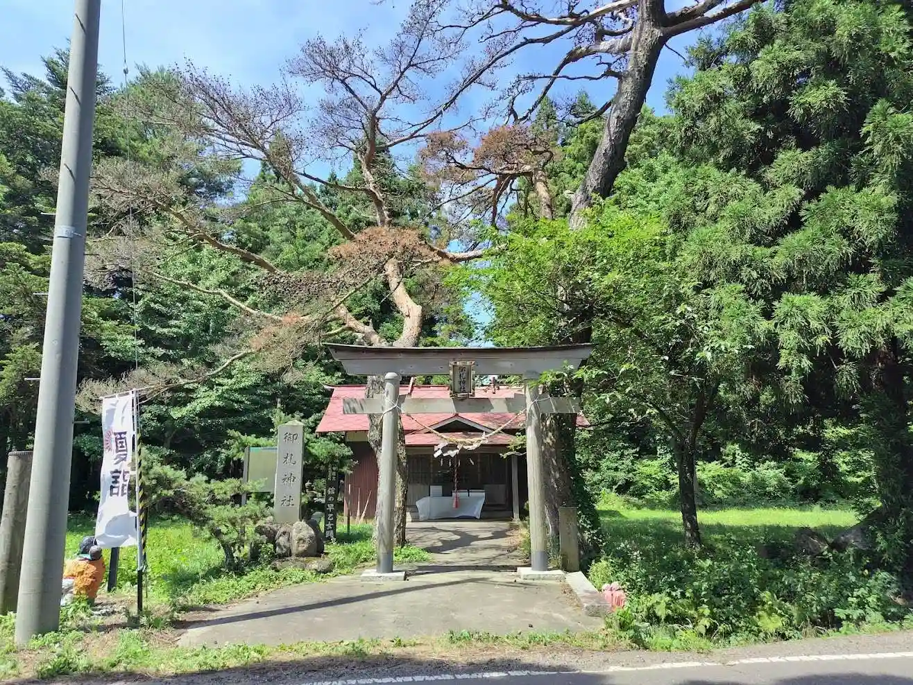 田園風景の広がる道路のすぐそばにありました。夏草が茂った駐車の側に、手作り風の乳地蔵がいらっしゃいました。遠州龍田の風神の御札を勧請して祀り、風害を除いてくれるよう祈願したのが御札神社の始まりとのことです。岩上神社と一緒の限定御朱印を頂きました。磐梯山と猪苗代湖、涼し気な御朱印です。