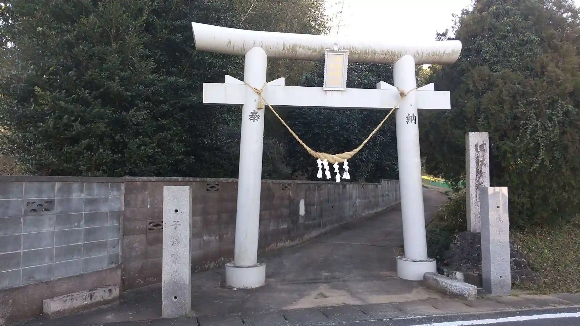 道沿いに鳥居があり、舗装された参道を進むと左側に階段。その先に社殿がある。