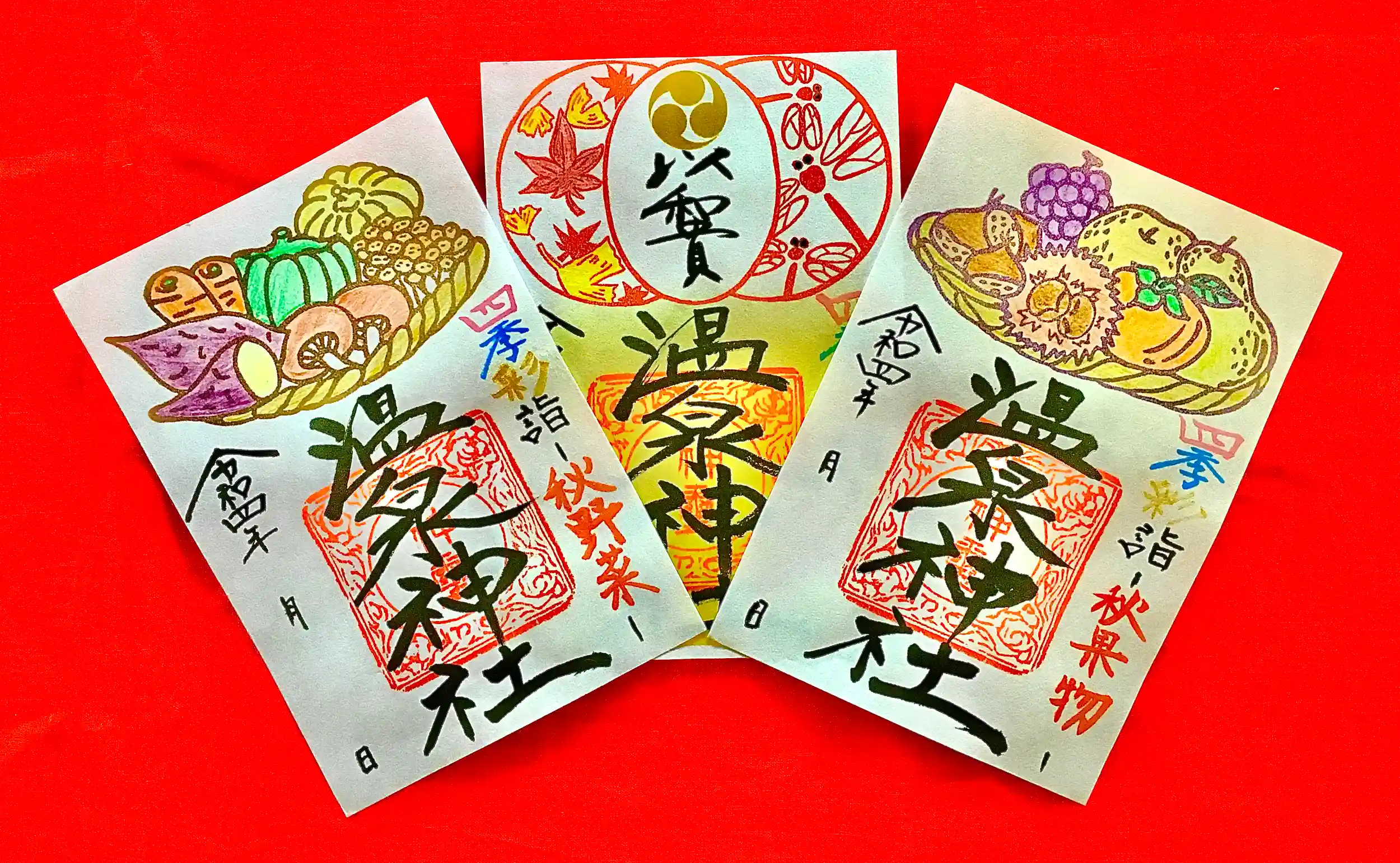 こちらの御朱印は、秋の味覚の[野菜]と[果物]を消しゴムはんこで作成し、色鉛筆で塗った優しい色合いとなっています。
