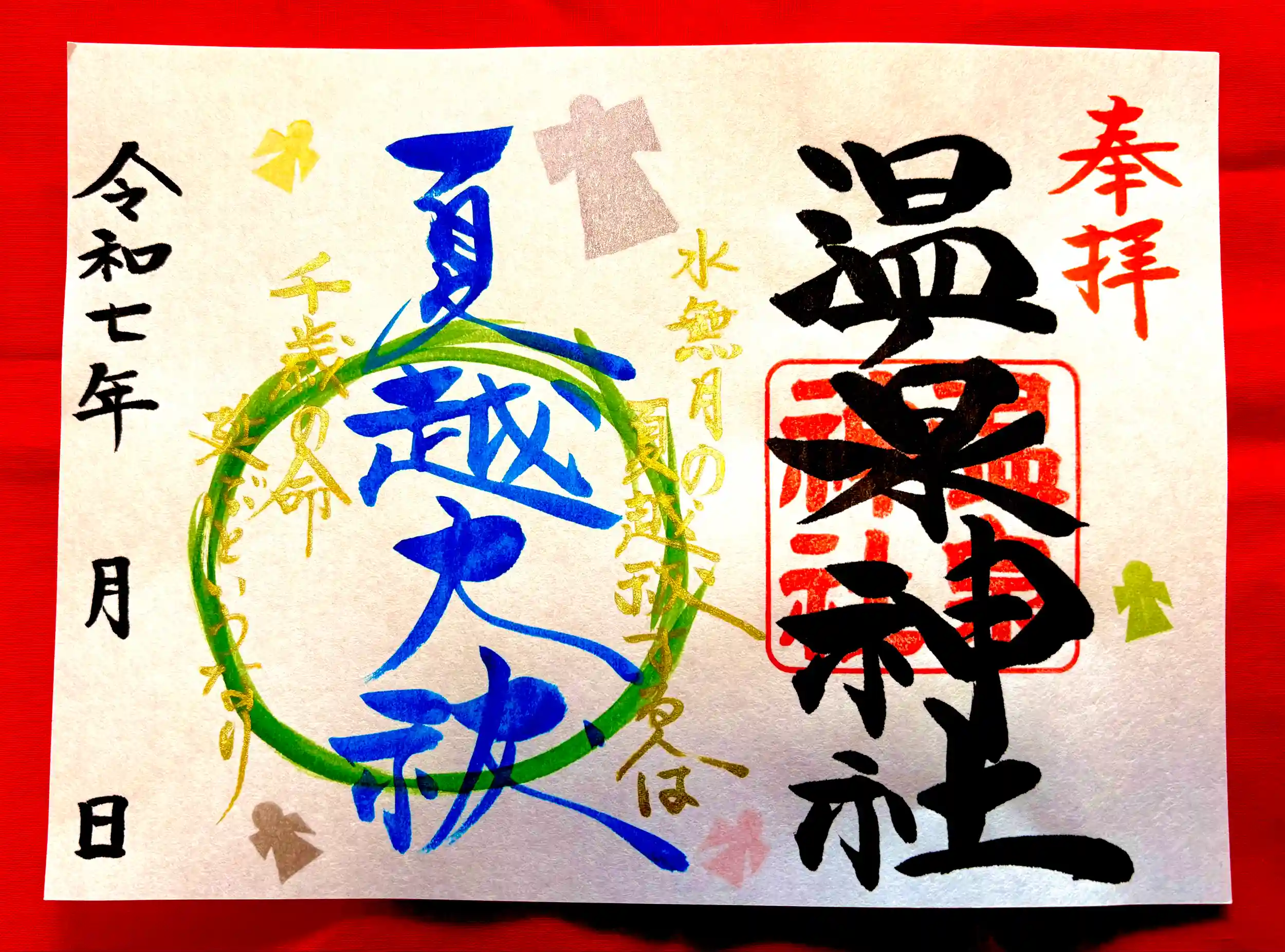 今回も茅の輪に唱え言葉がデザインされていて、五色の人形(ひとがた)が色鮮やかな御朱印となっております。
