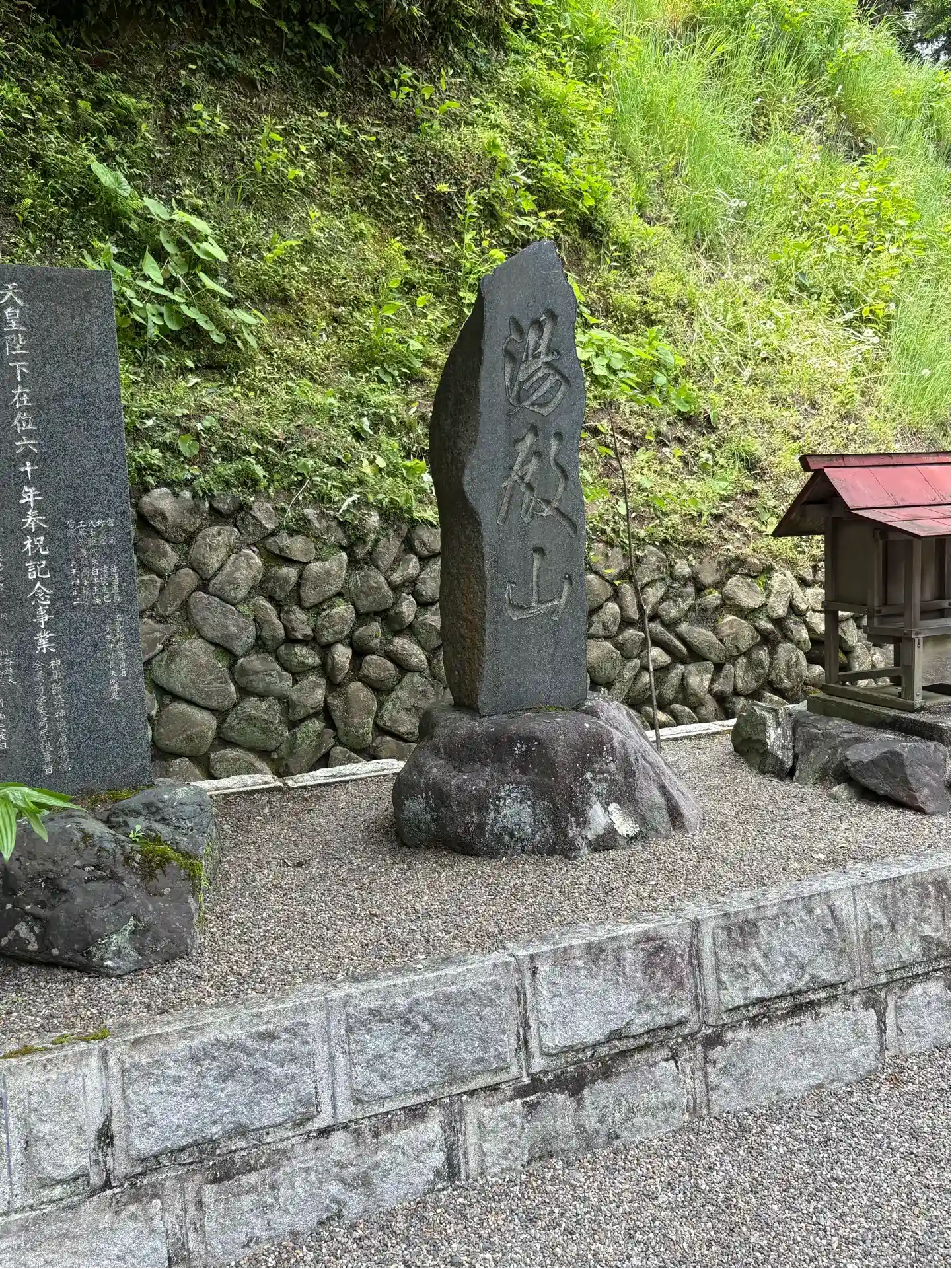 鳥居をくぐった先にある石碑からは、温泉が湧いているのか湯気が出ています。
