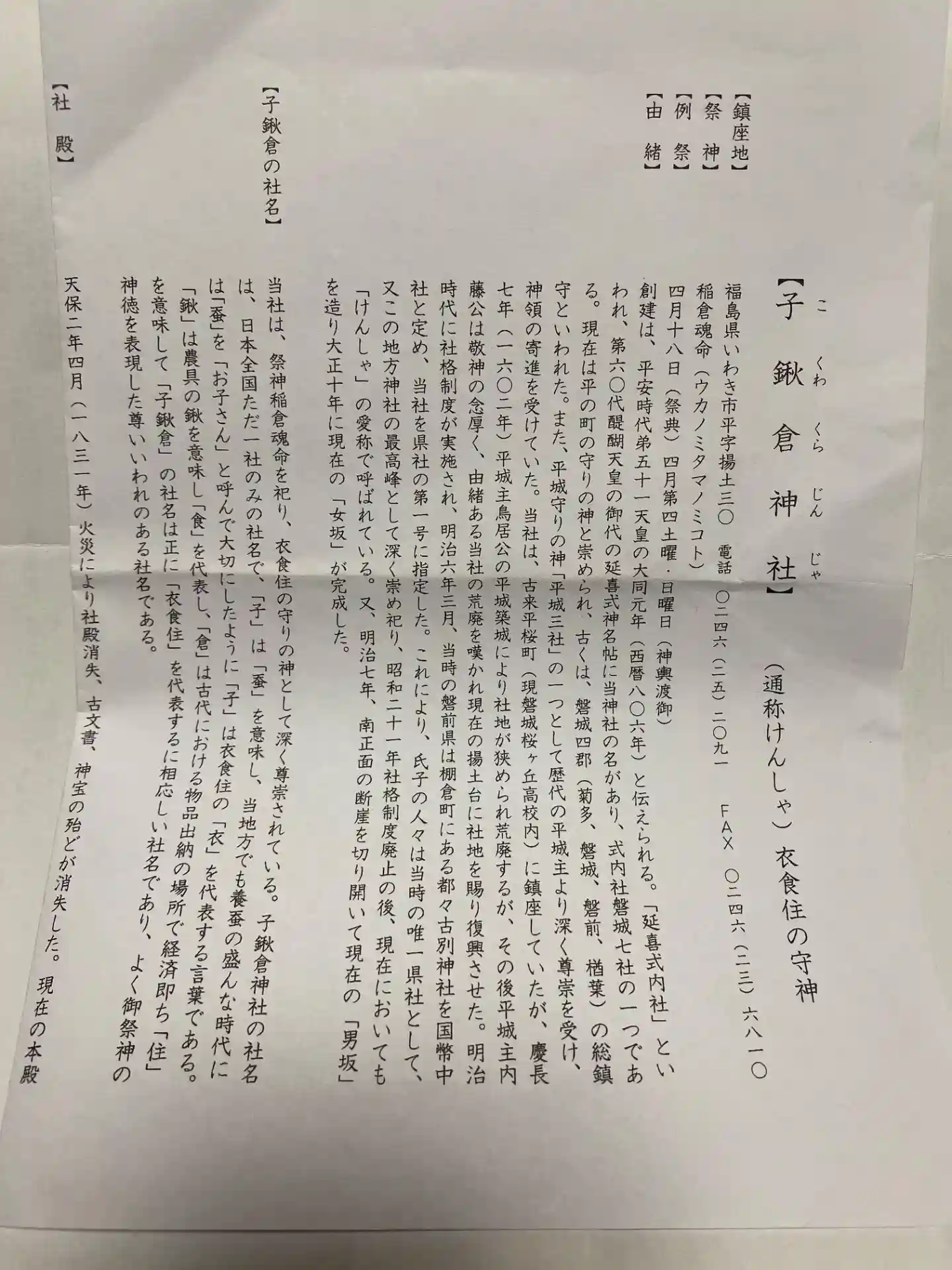 子=衣、鍬=食、倉=住で子鍬倉神社