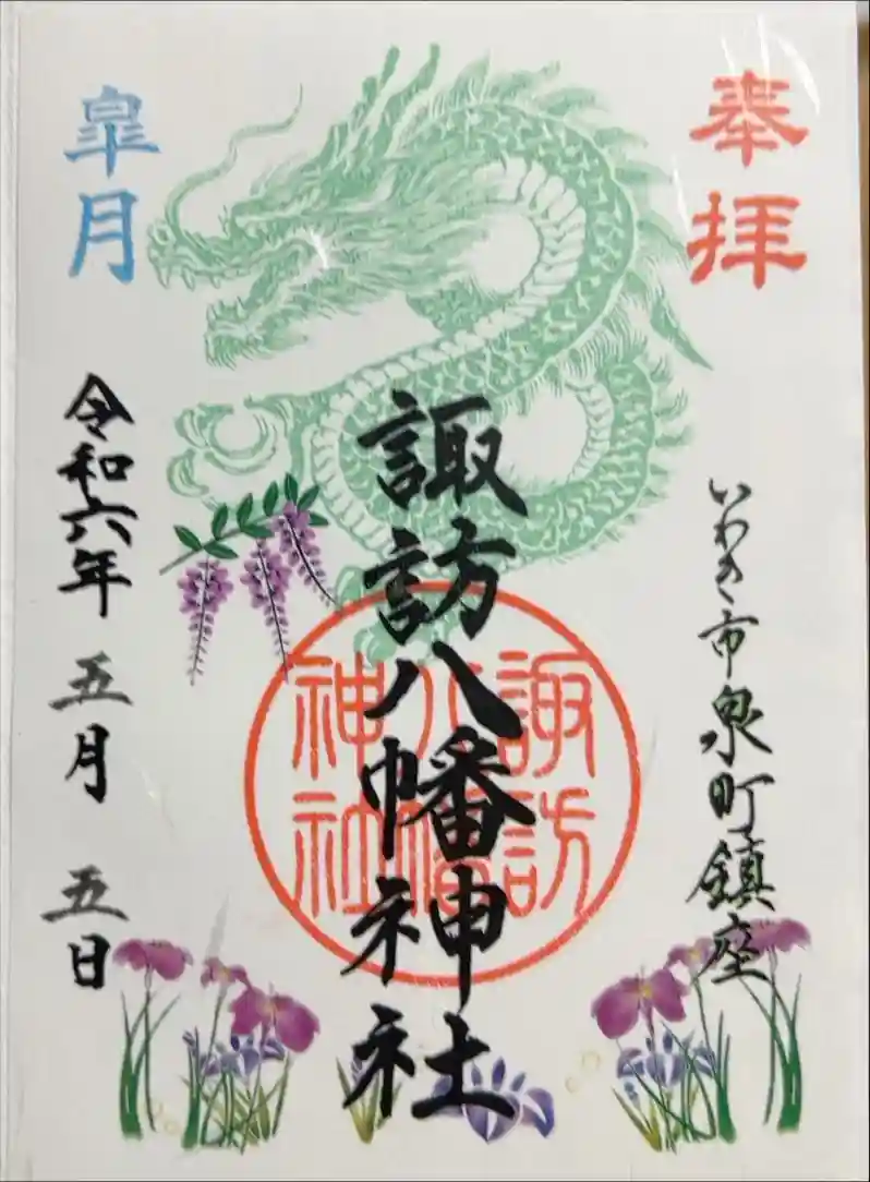 5月の御朱印は、龍に菖蒲や藤など季節の花がデザイン