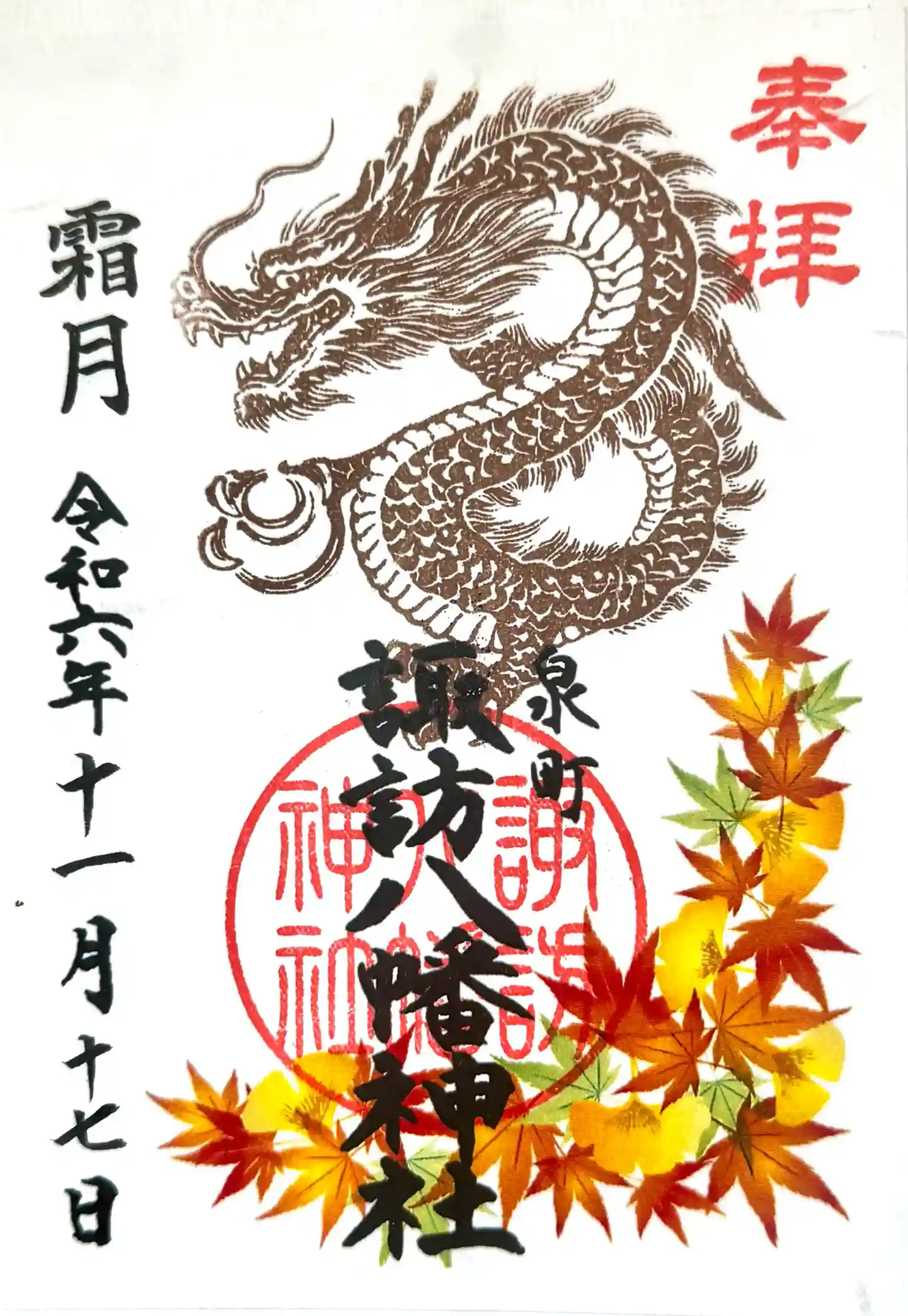 11月の御朱印は、橙色の干支ヘビと、色づく紅葉が秋の景色をやわらかく彩ります。