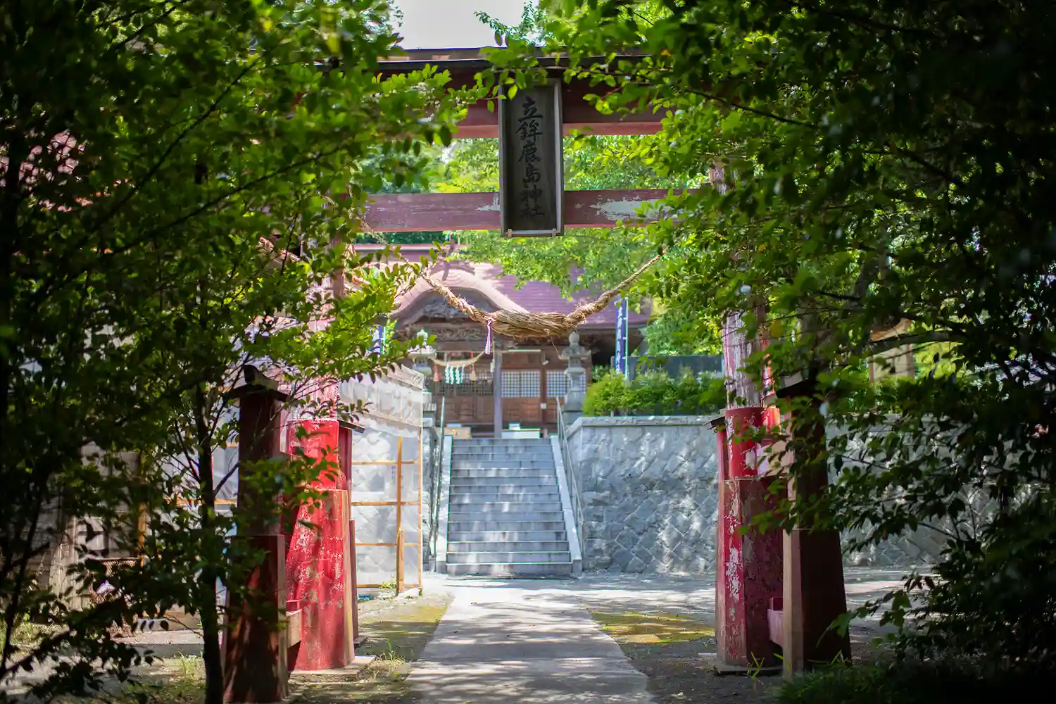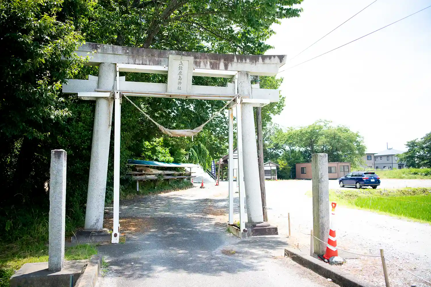 地震の影響でしょうか、鳥居に支えがあります。この奥が駐車場です。広いです。