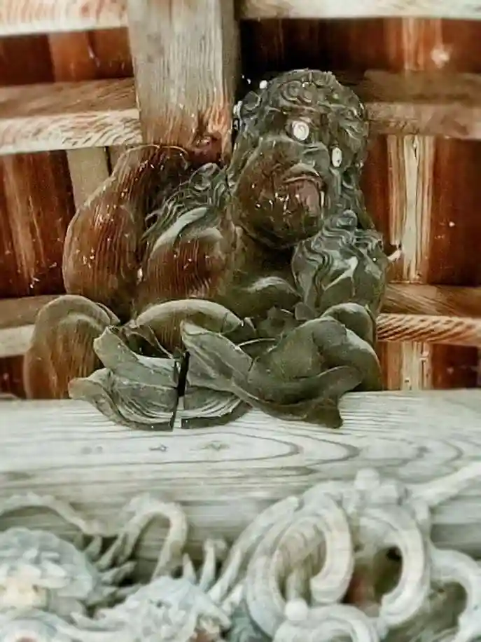 向拝の龍は折れそうで折れないヒゲやまとわる波、さらに、上の鳳凰も細かいです。ん?屋根を、支えるあの方は、、