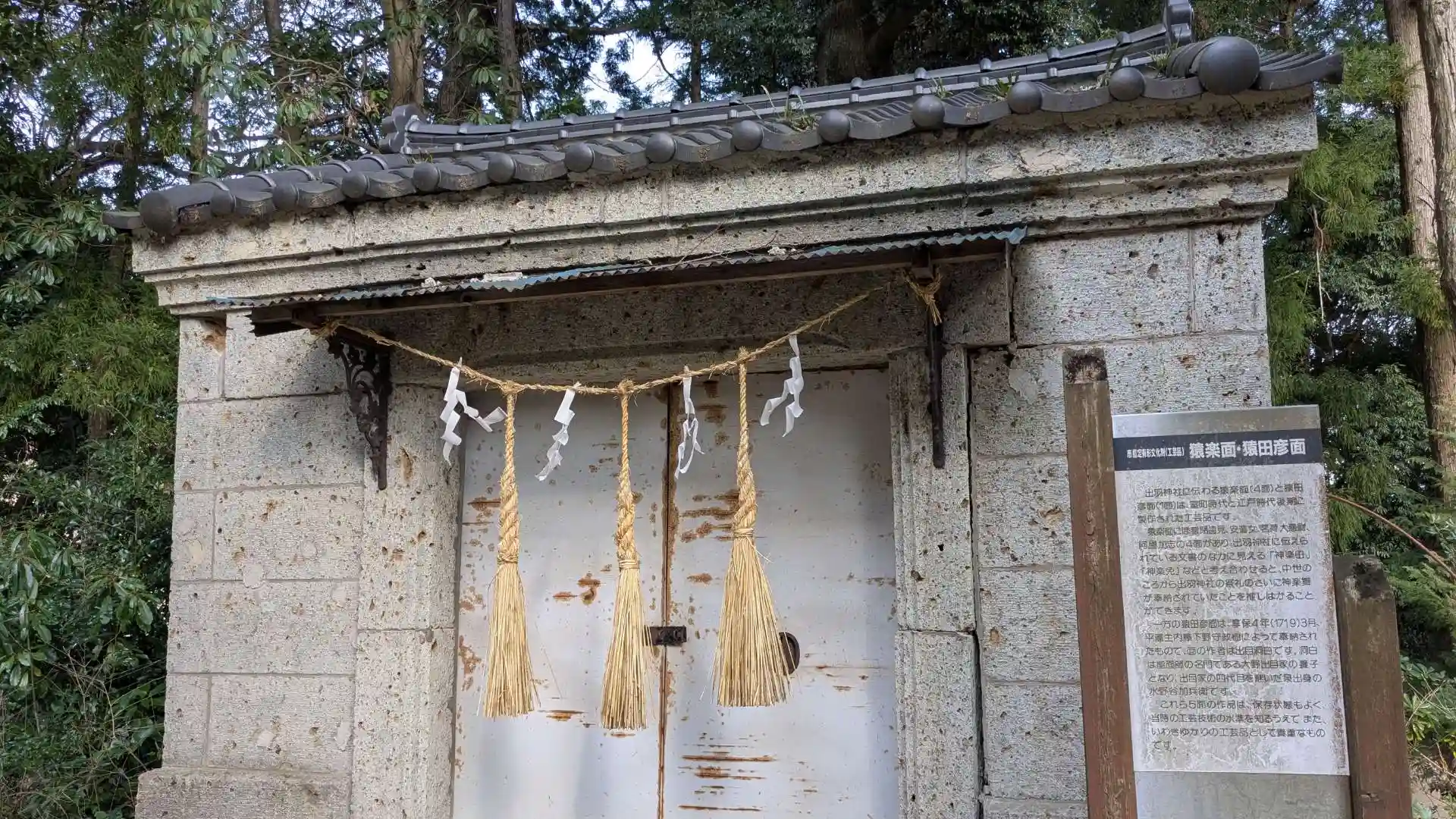 いわき回廊美術館のすぐ傍にあります。出羽国から羽黒権現を勧請して建てられました。小さいながら歴史ある神社で本殿や納められた猿楽面などが文化財として指定されています。木々に囲まれた境内はまさに聖域の様な雰囲気。本殿前や参道の途中にお地蔵様が祀られていて神仏習合が今も残されています。参道の入口にあった斜めに切られた鳥居の様な石柱には東日本大震災と刻まれています。詳しいことは分かりませんが同じいわき市の湯本にある温泉神社にもこれと同じ物がありそちらは震災の時に倒壊した鳥居の跡との事でこちらも恐らくは同じ様に倒れた鳥居の跡かと思われます。