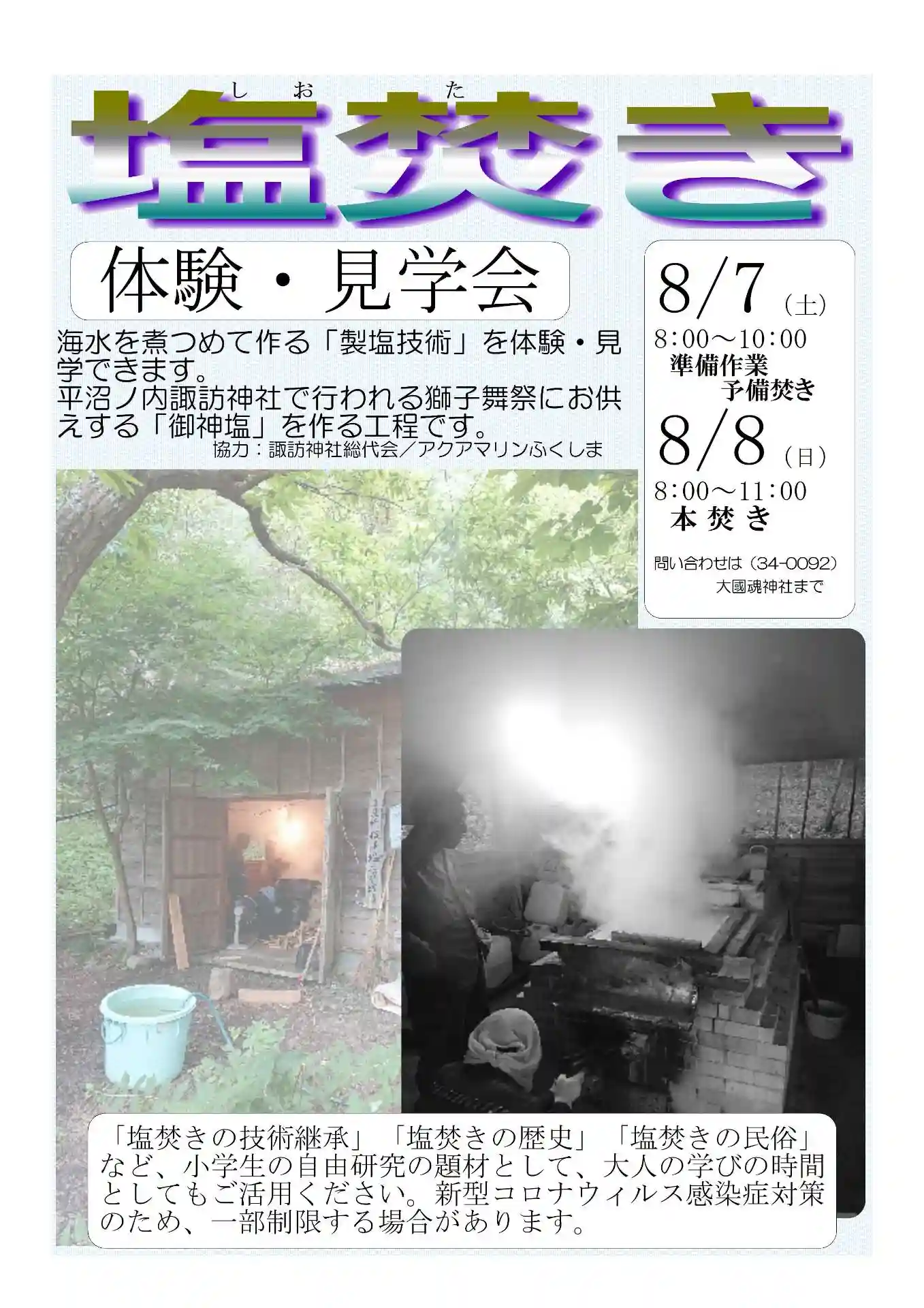 8月7日(土/8:0~10:00)、8月8日(日/8:00~11:00)神社西麓の「塩焚き小屋」にて塩焚きを行います。体験・見学も自由にできます。めずらしい光景ですので、夏休みの自由研究の材料に、大人の学びの時間に活用ください。
