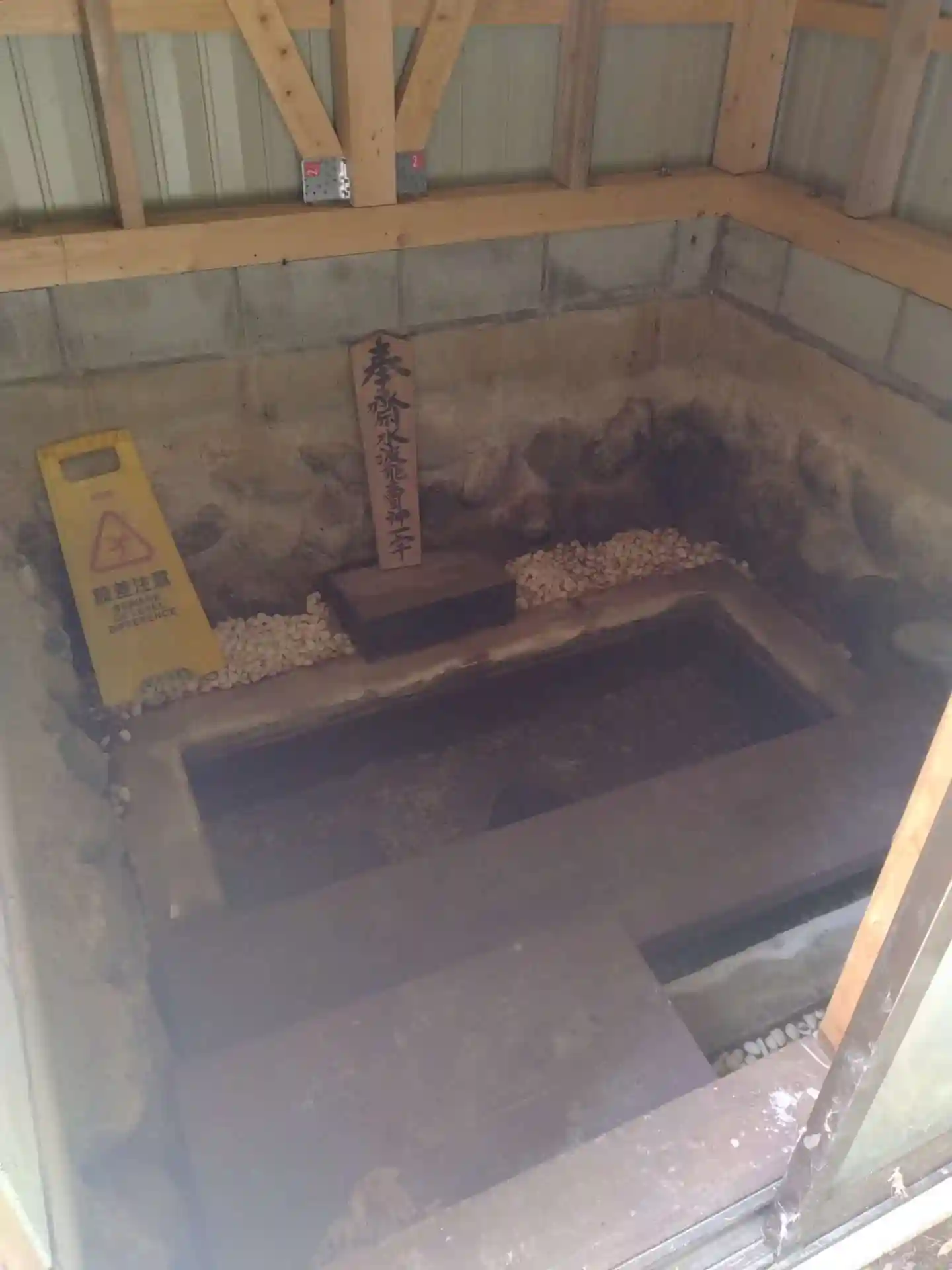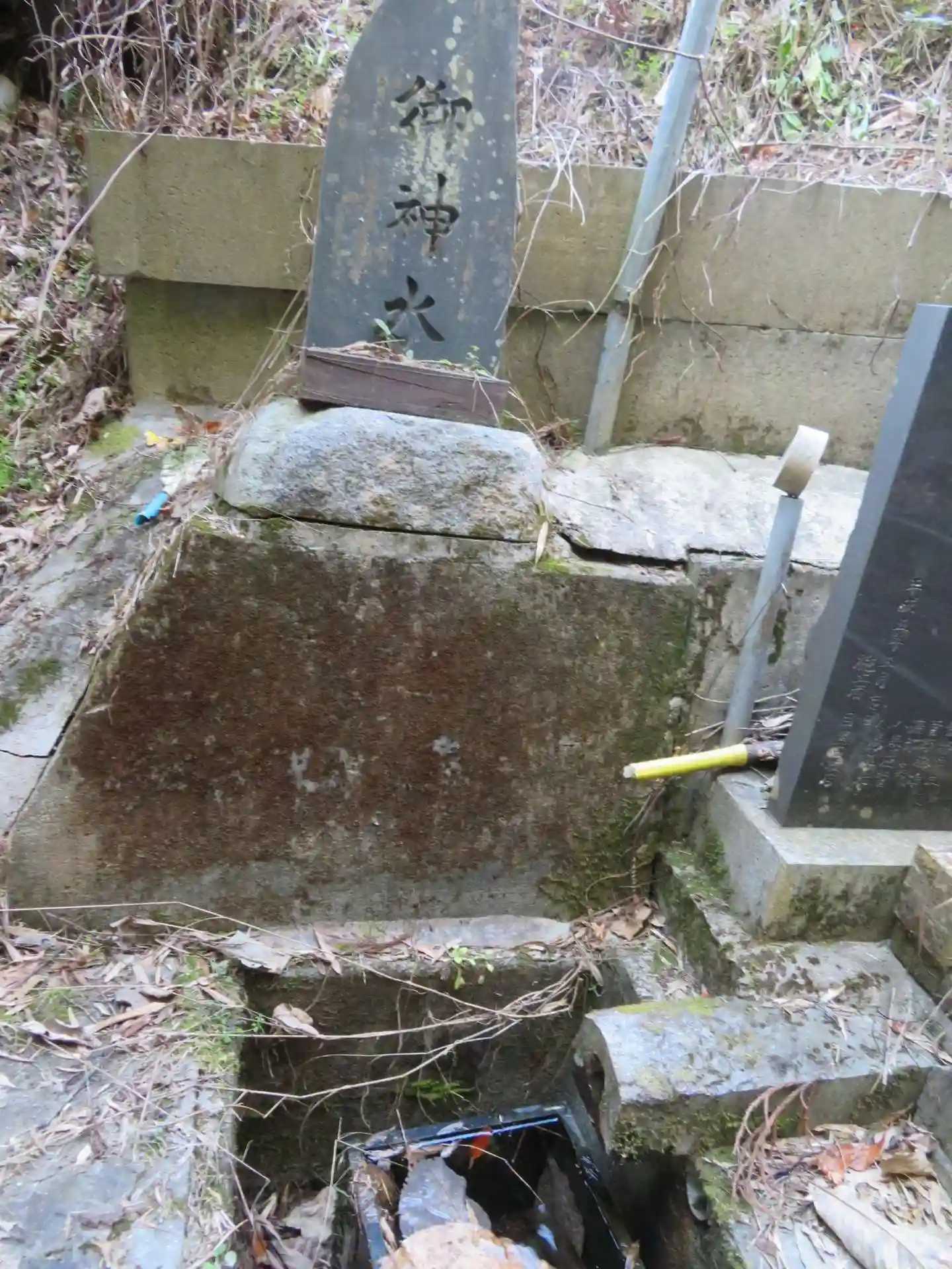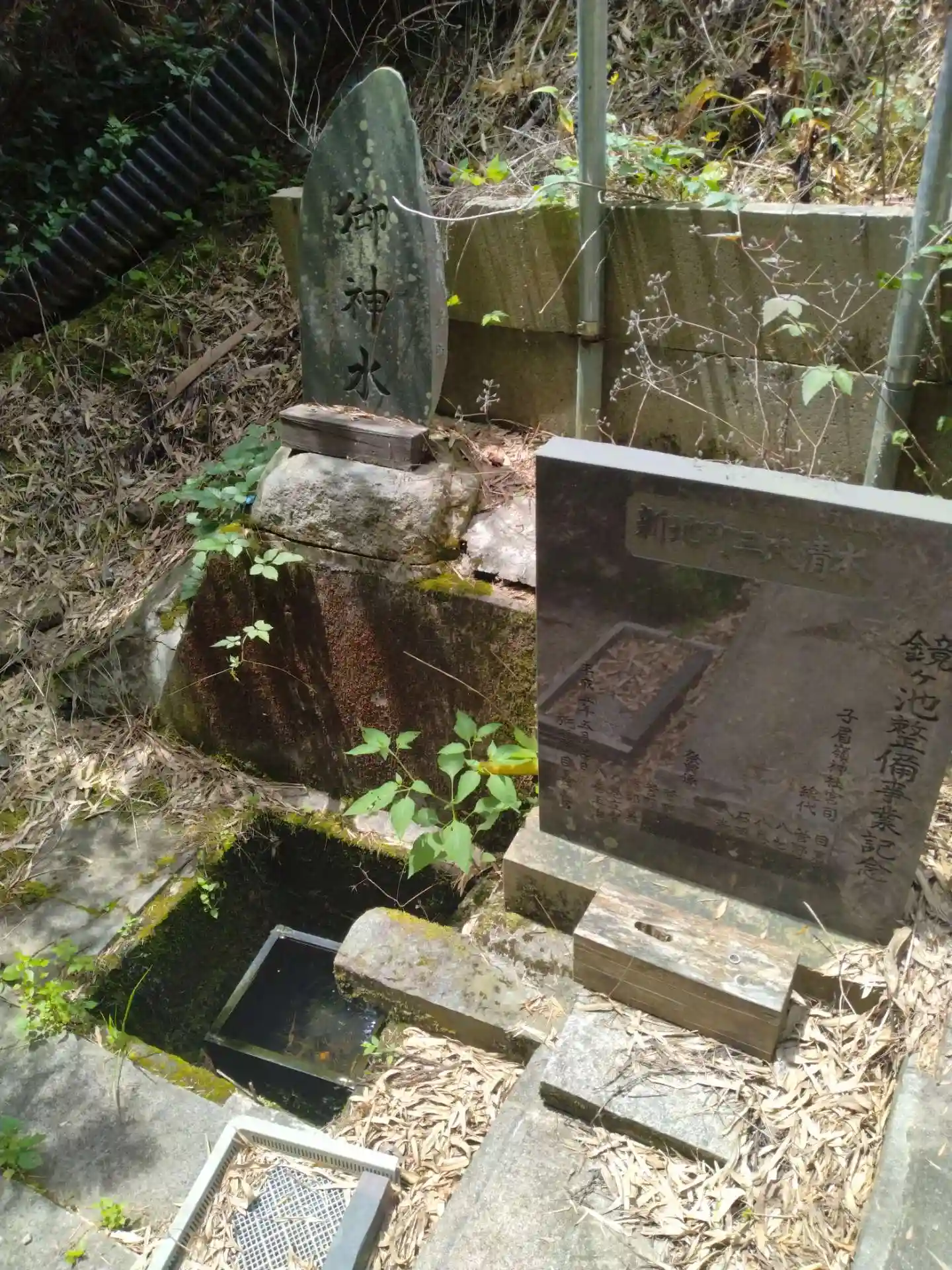 子眉嶺神社 小屋より更に奥側にある()鏡ヶ池整備事業記念碑、御神水碑、泉の水)です