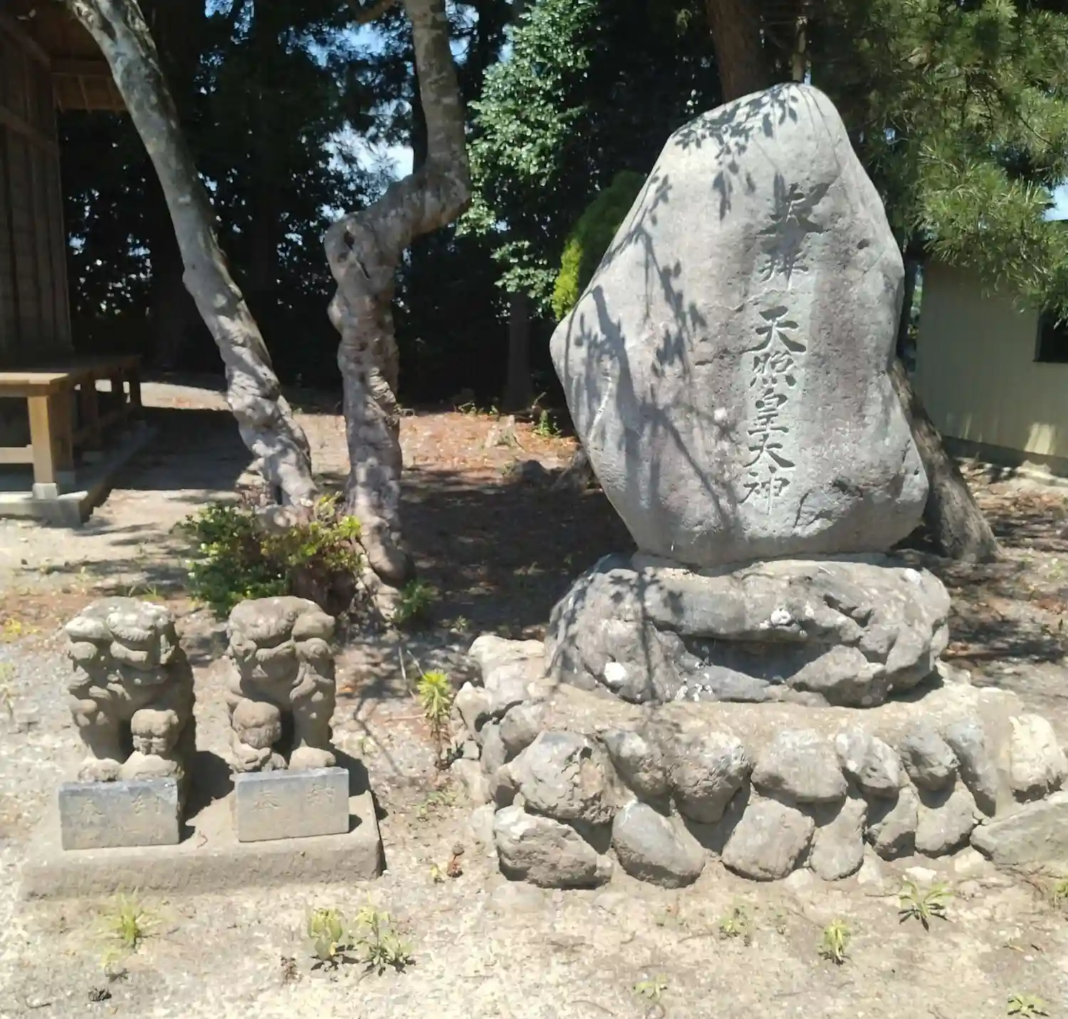 天照神社 境内にある(左側に小さな阿吽の狛犬さんが鎮座、右側に奉拝天照皇大神碑)です