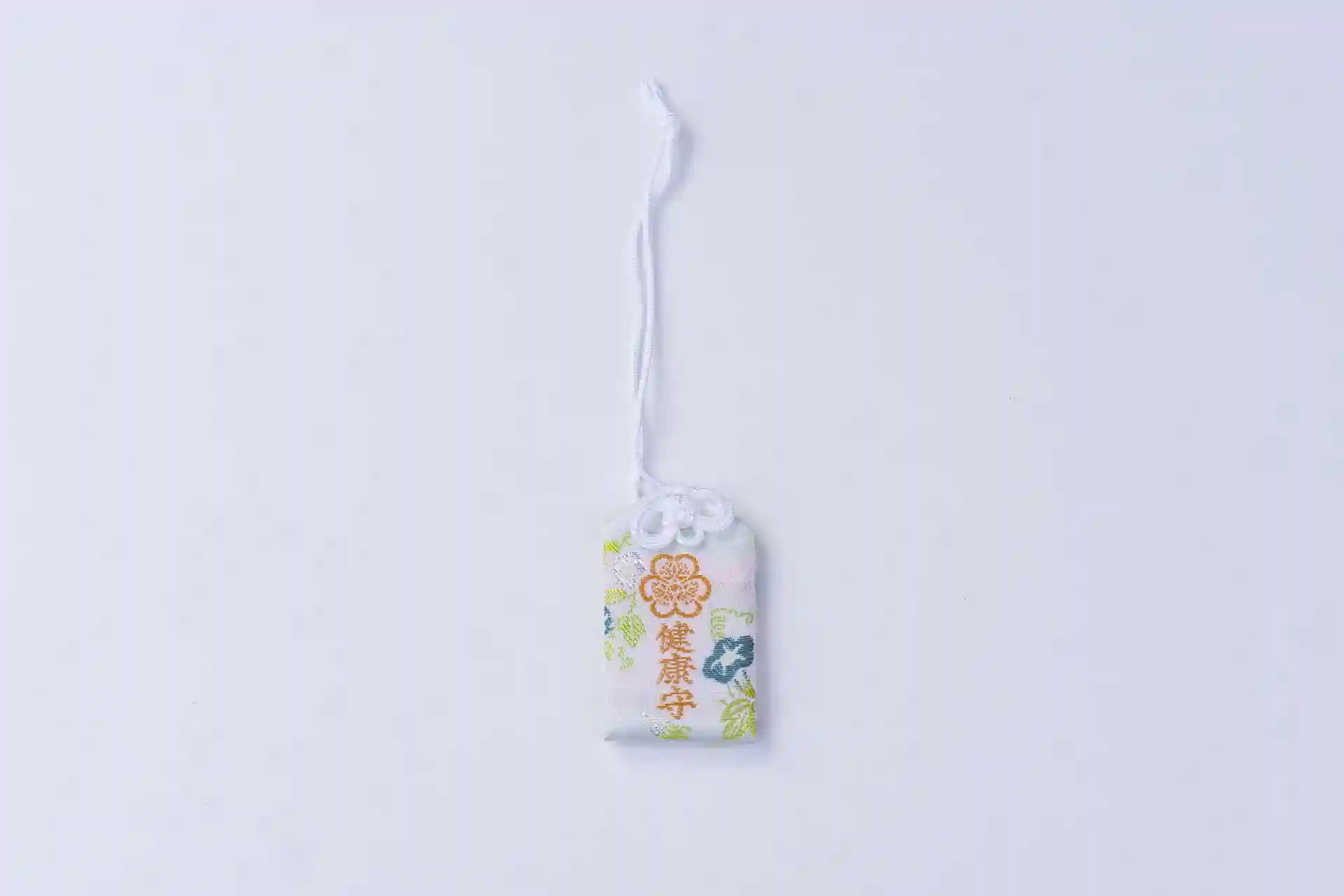 子供の守護神という花言葉を持つ茅の紋を織り込んだ純白のお守りです。