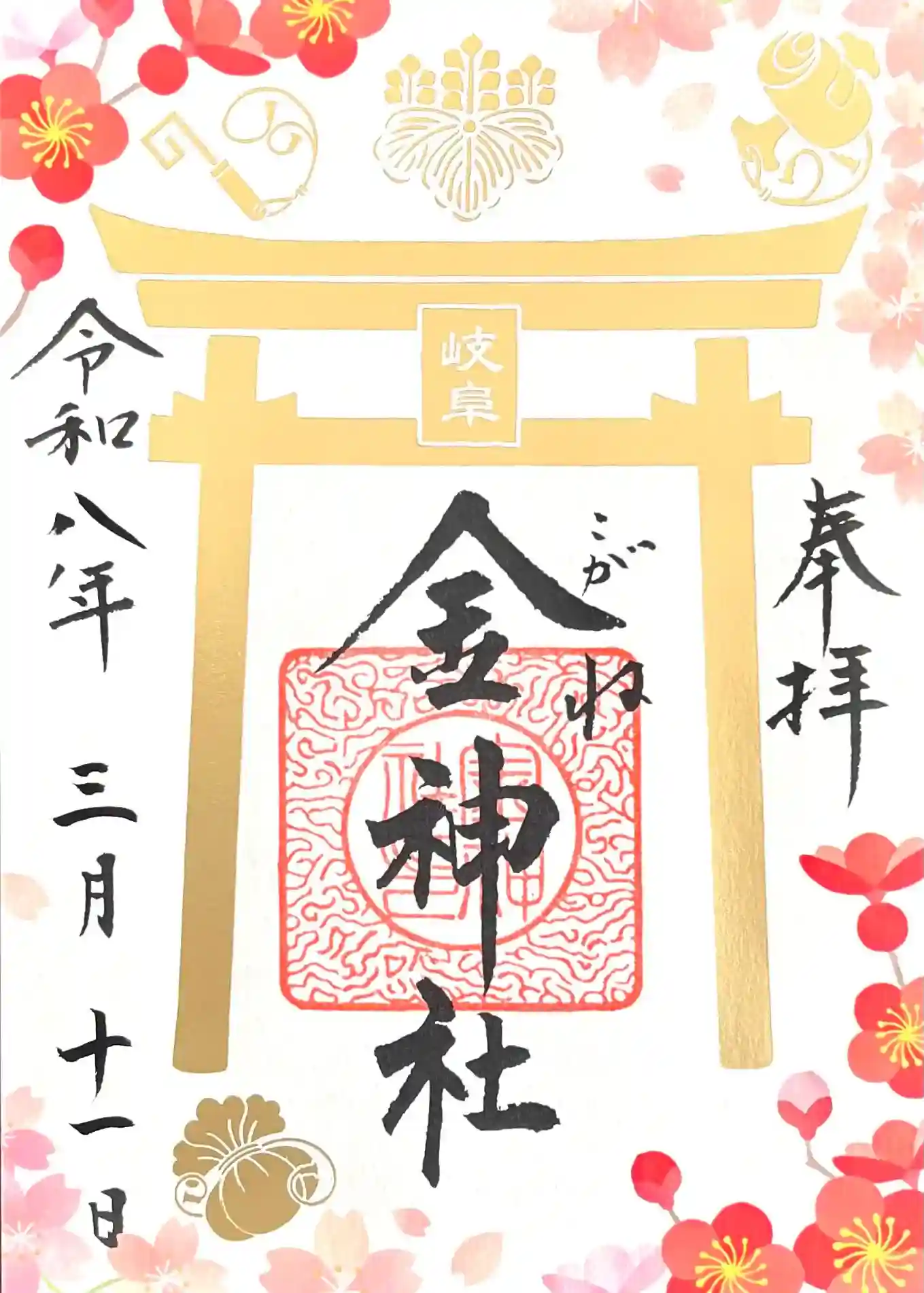 | 御朱印 | あり 真ん中に岐阜金神社と書かれ、右上に金色で社紋、真ん中に金神社の印が押されています。
