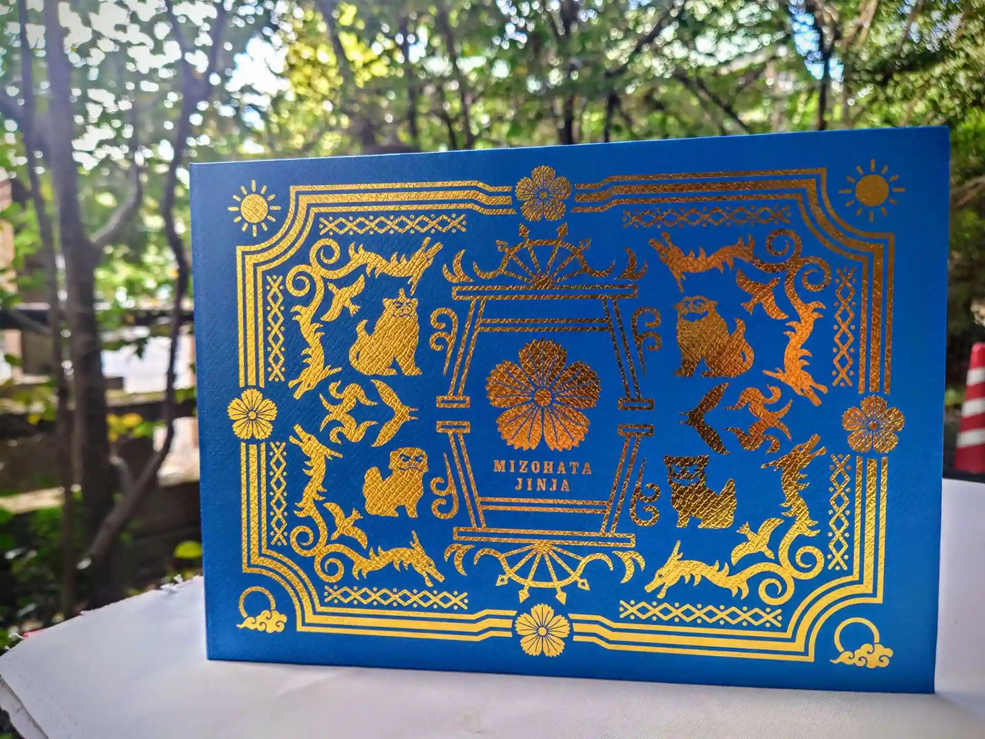 古い洋書のような模様ですがそれぞれの模様は鳥居や狛犬などが描かれ、当社に所縁がある柄となっております。ご自身の参拝の書、物語をお綴り下さい。