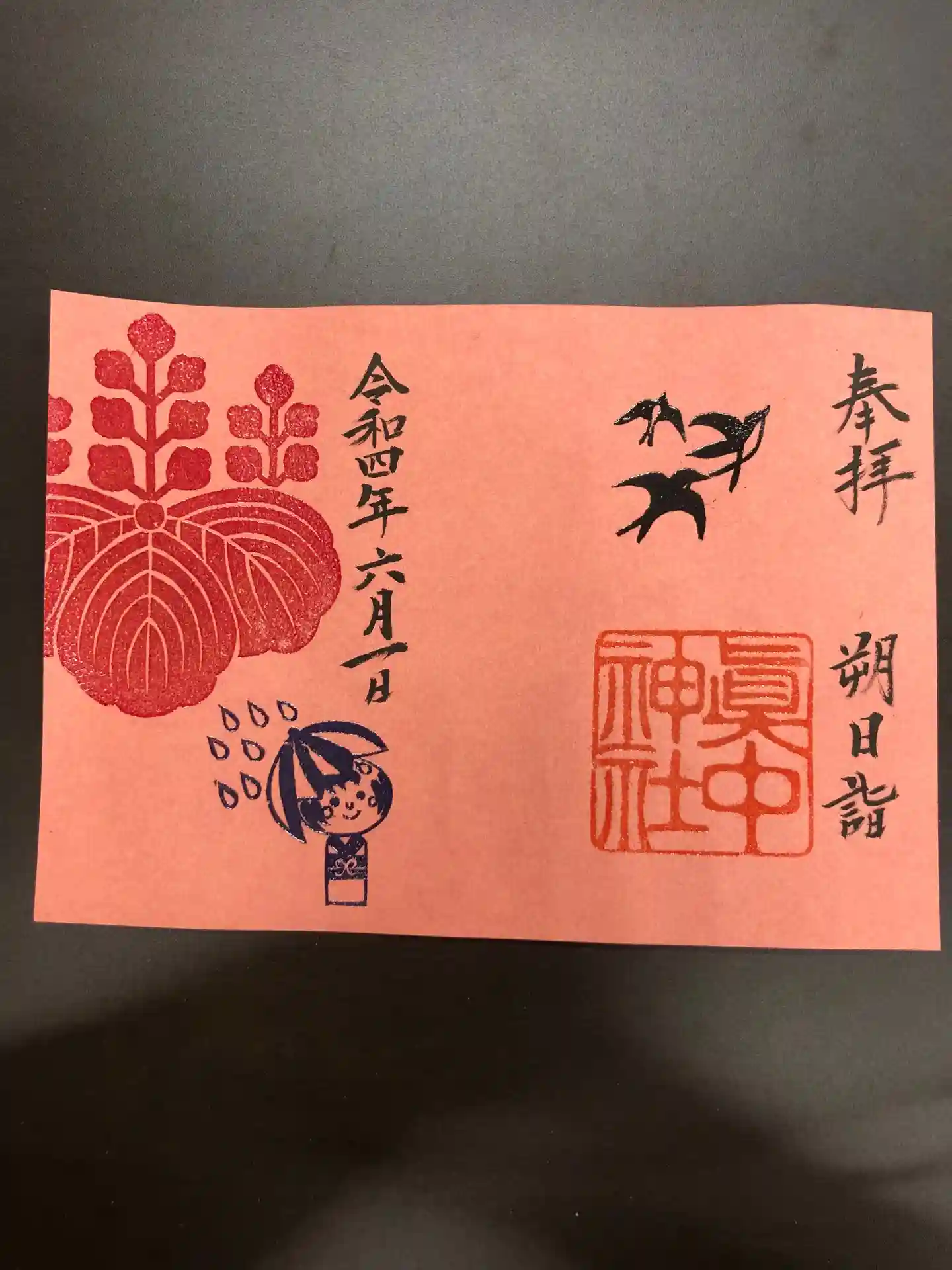 朔日詣の御朱印はツバメと傘をさしたこけしちゃんです。エンボス加工しておりますので書置きのみです、