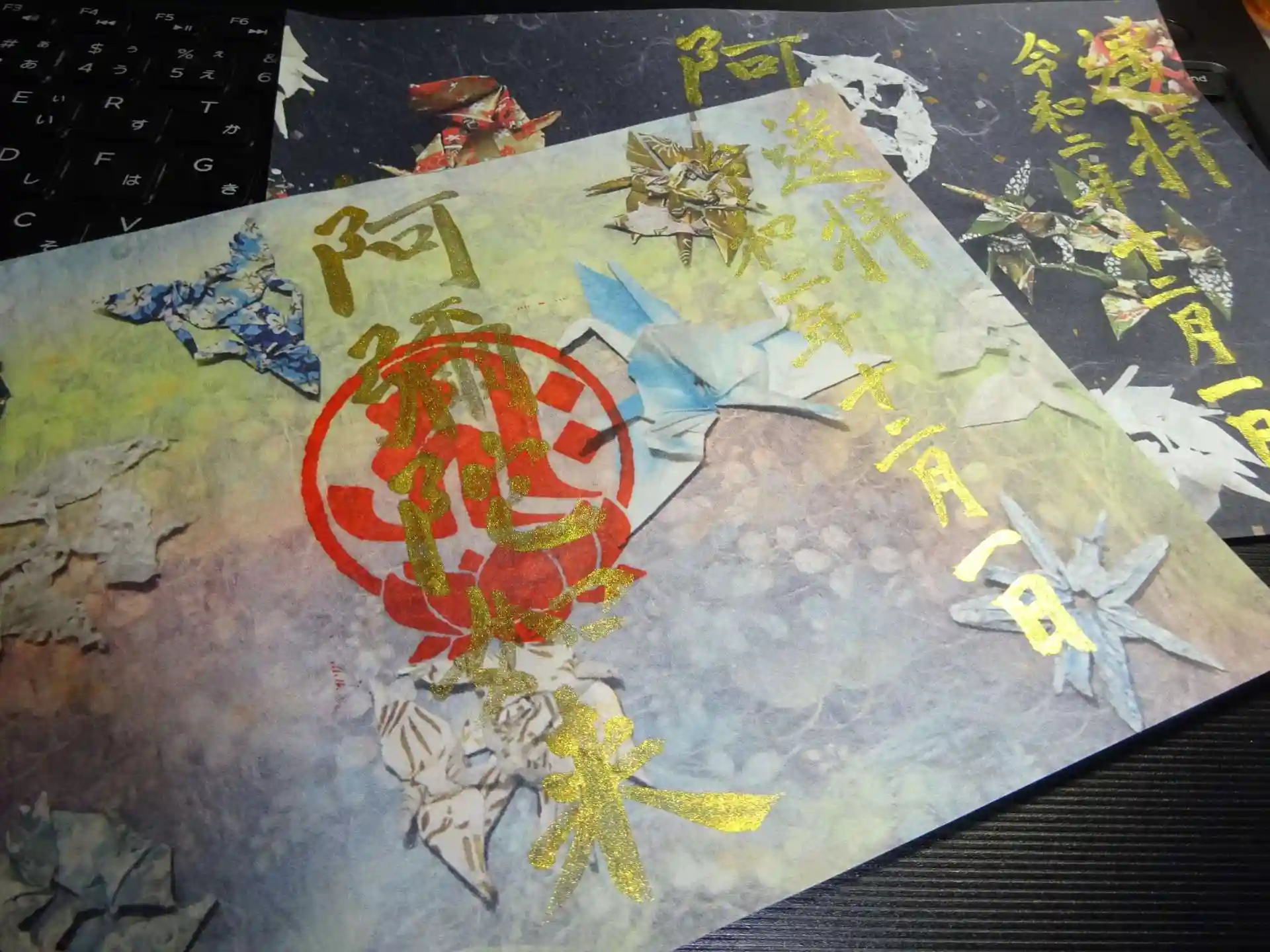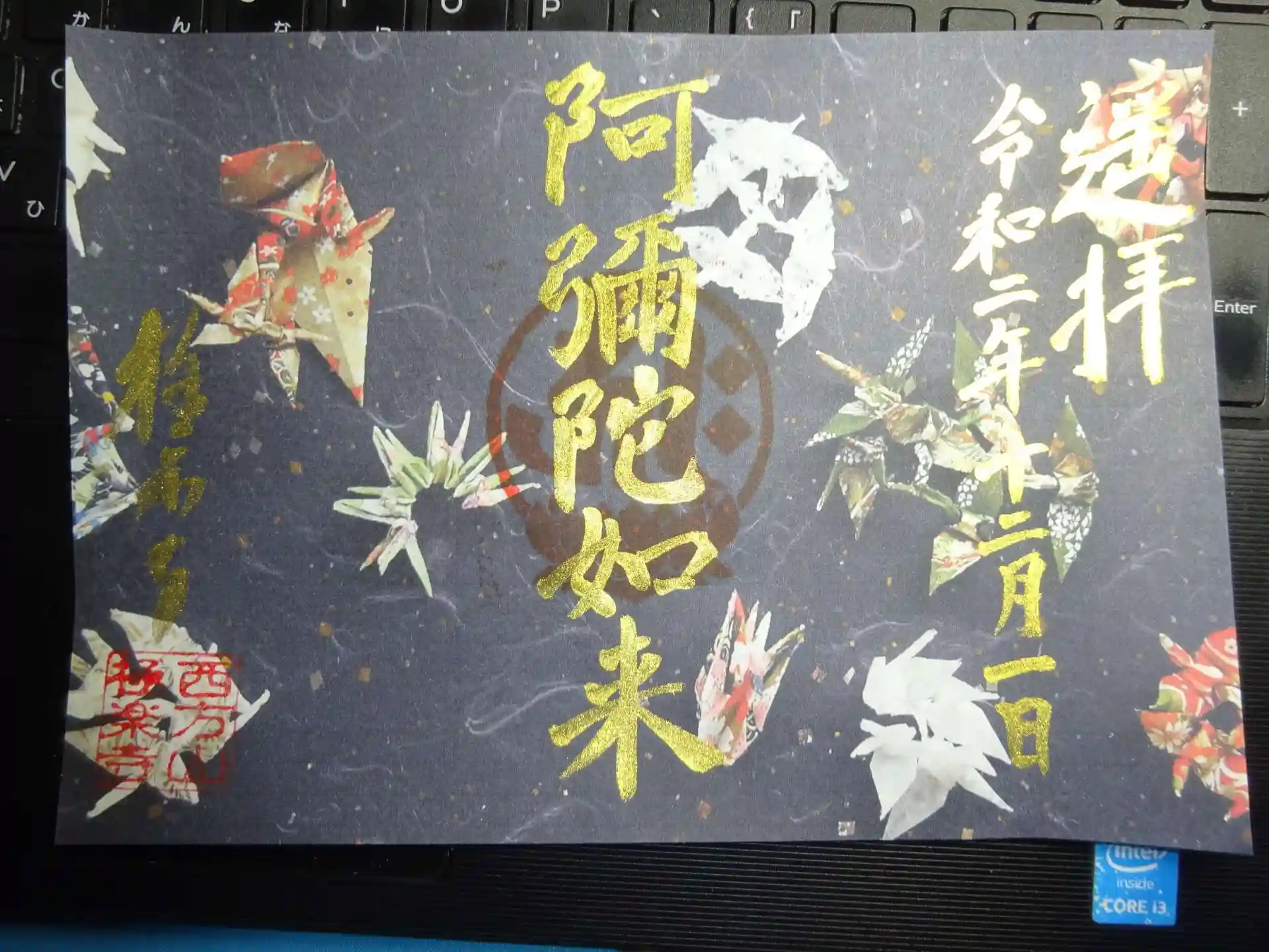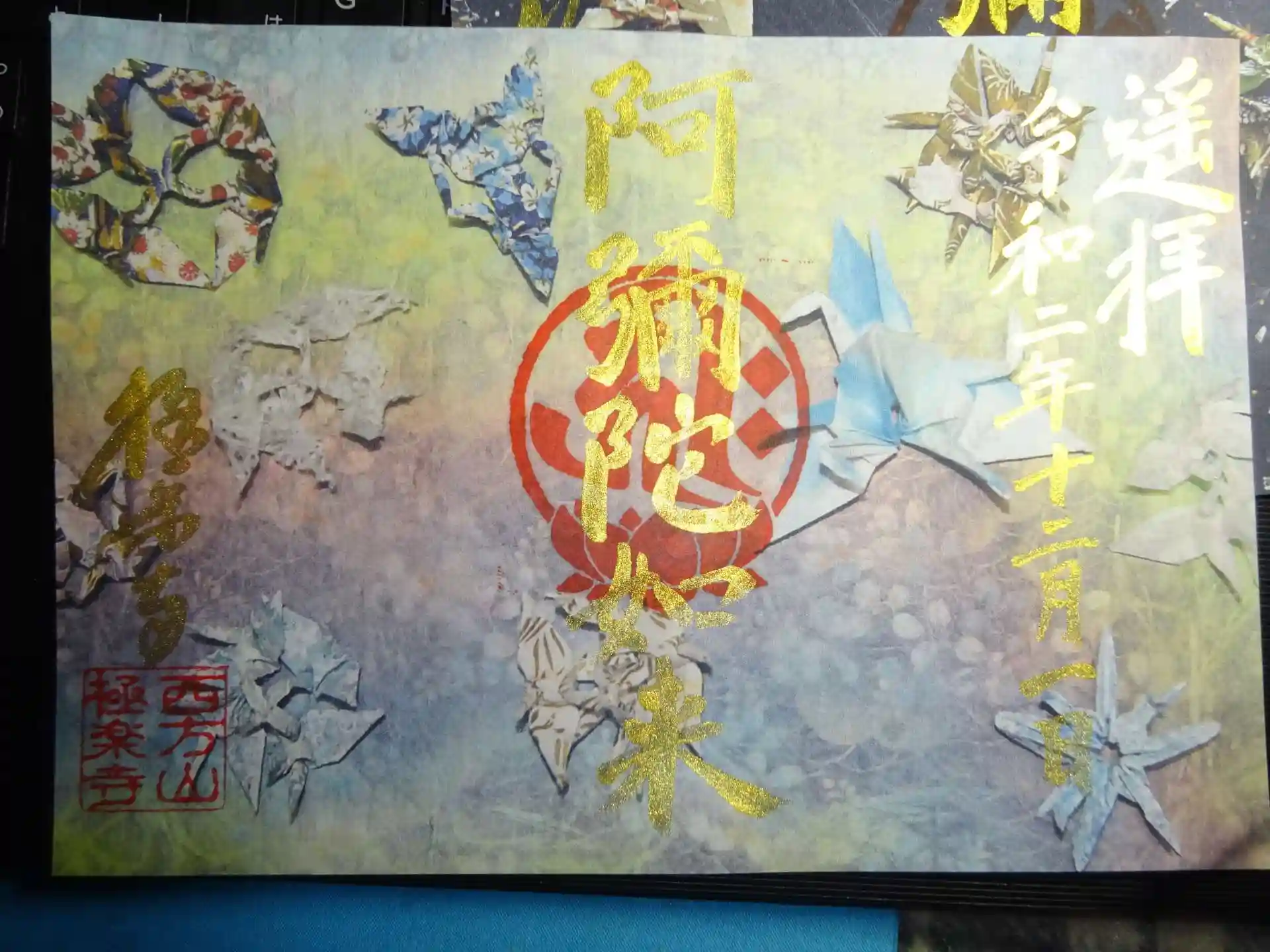 冬限定御朱印<冬のにおい> 黒系を基調にカラフルな折り紙模様をちりばめた御朱印