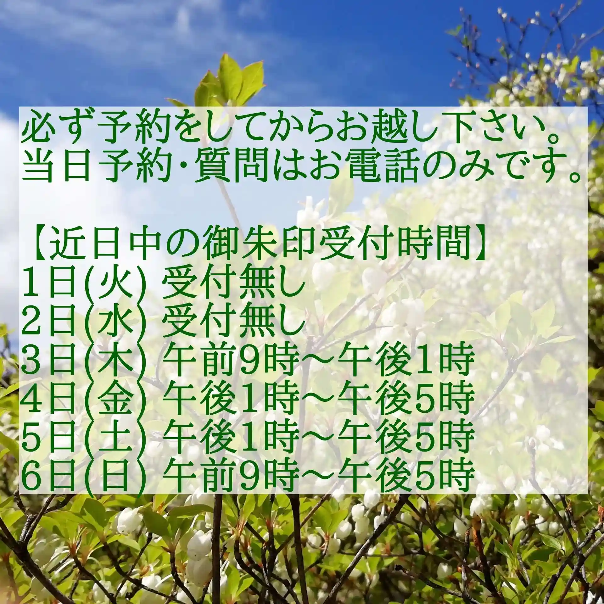 また、メールやメッセージを当日頂いても御朱印の対応等で見ることができません。ご了承下さい。