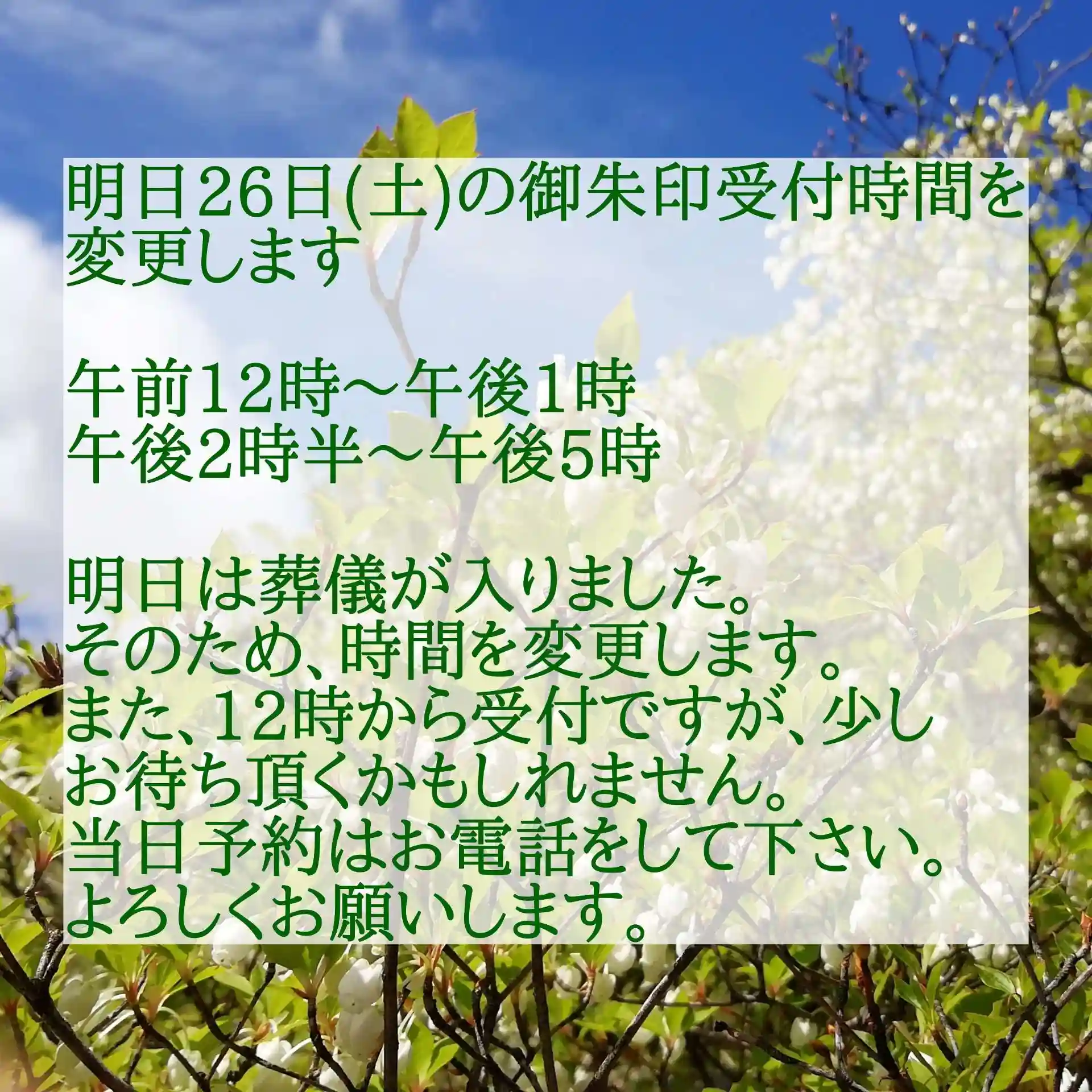 明日26日の御朱印受付時間が変更になりました。