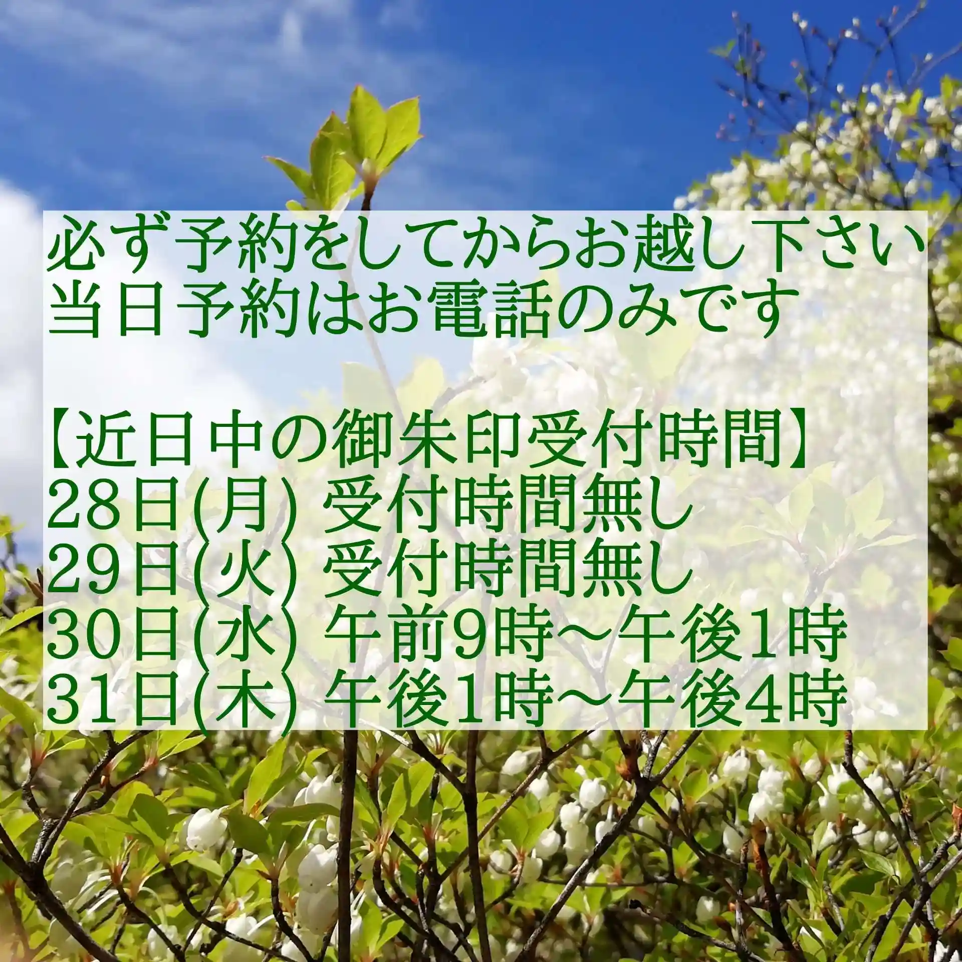また、メールやメッセージを当日頂いても御朱印の対応等で見ることができません。ご了承下さい。