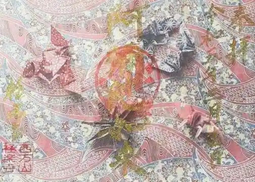 背景の連なる鶴は、1枚の和紙から複数の鶴を