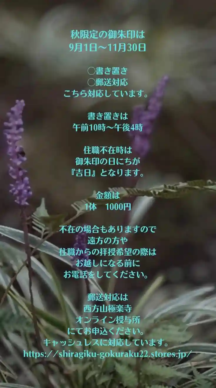 直接参拝が難しい方は、西方山極楽寺オンライン授与所から申込をして頂ければ郵送しております。よろしければご覧ください。