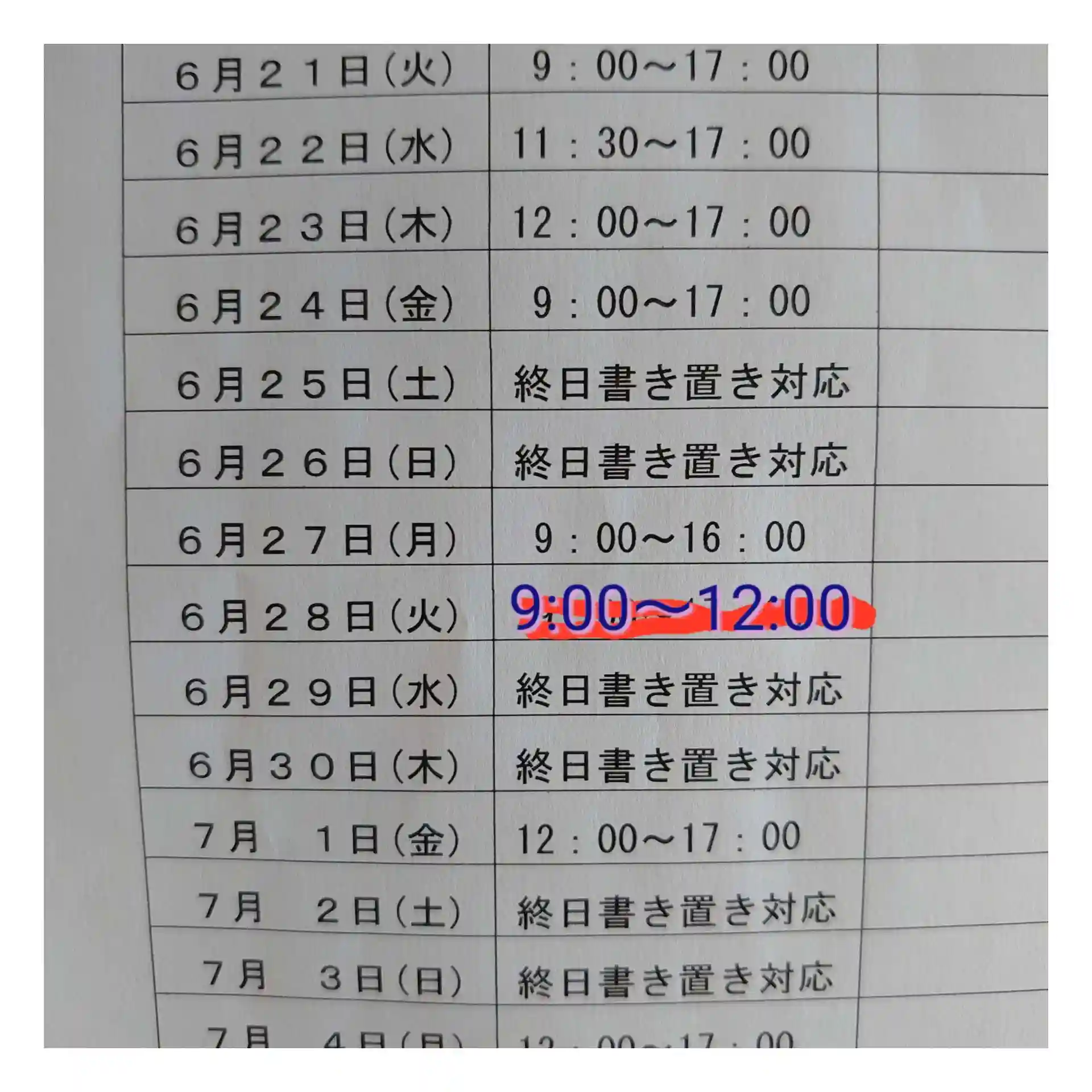 6/28(火)の手書き対応時間について、変更のお知らせをいたします。