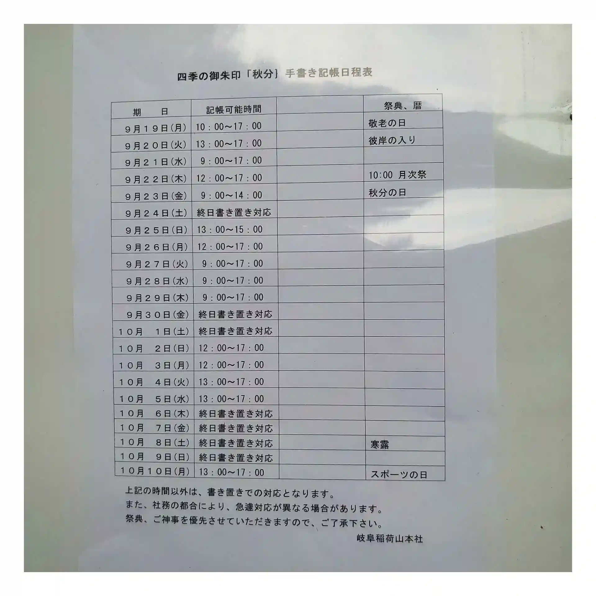 9月19日より10月10日までの期間、四季の御朱印「秋分」を頒布いたします。中秋の名月は、過ぎましたが、満月で飾ったものと、これから見られる紅葉で飾ったものと2種類用意いたしました。手書き対応日程は、写真を参考にしていただき、皆様のご参拝をお待ちいたしております。