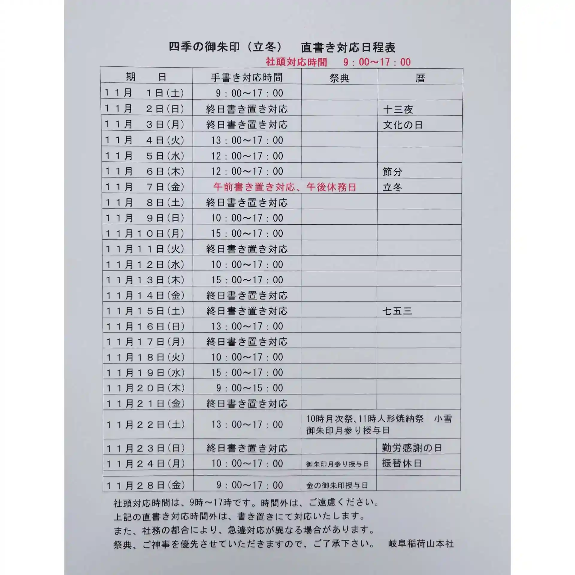 11/1〜11/24は「四季の御朱印 立冬」を、11/1〜1/31は「季節の御朱印 玄冬」を頒布いたします。直書き対応日程は、写真の日程表で、ご確認ください。